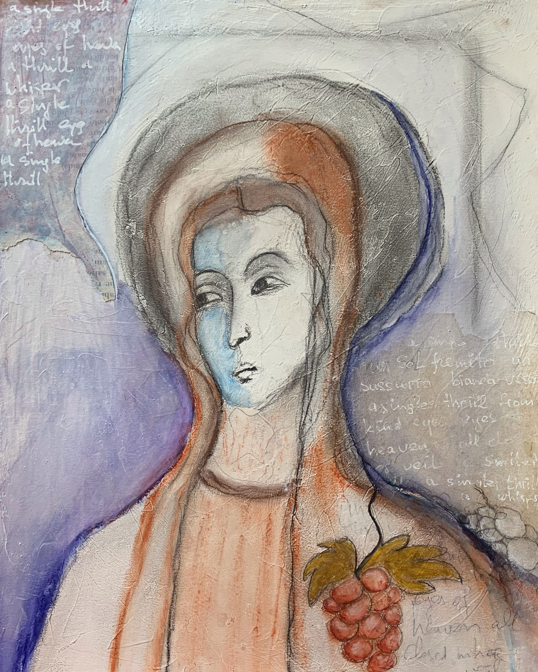 Inspired by a visit to the tiniest village near Foligno, Pale in Italy where the hermitage of Santa Maria Giacobbe is high in the mountains. There was a poster on the wall of this gorgeous little town portraying the saints of a dilapidated fresco in this hermitage which is impossible to get to. Of one of these saints the expression was just visible and it captured my imagination and I could feel the emotions straight away so I had to create a little artwork immediately coming home. I found these beautiful little phrases in the poetry book I bought at the antique market which I thought were exactly expressing the emotions I felt looking at her eyes which of course are part of the text in the painting now! I used recycled tea bags for texture.