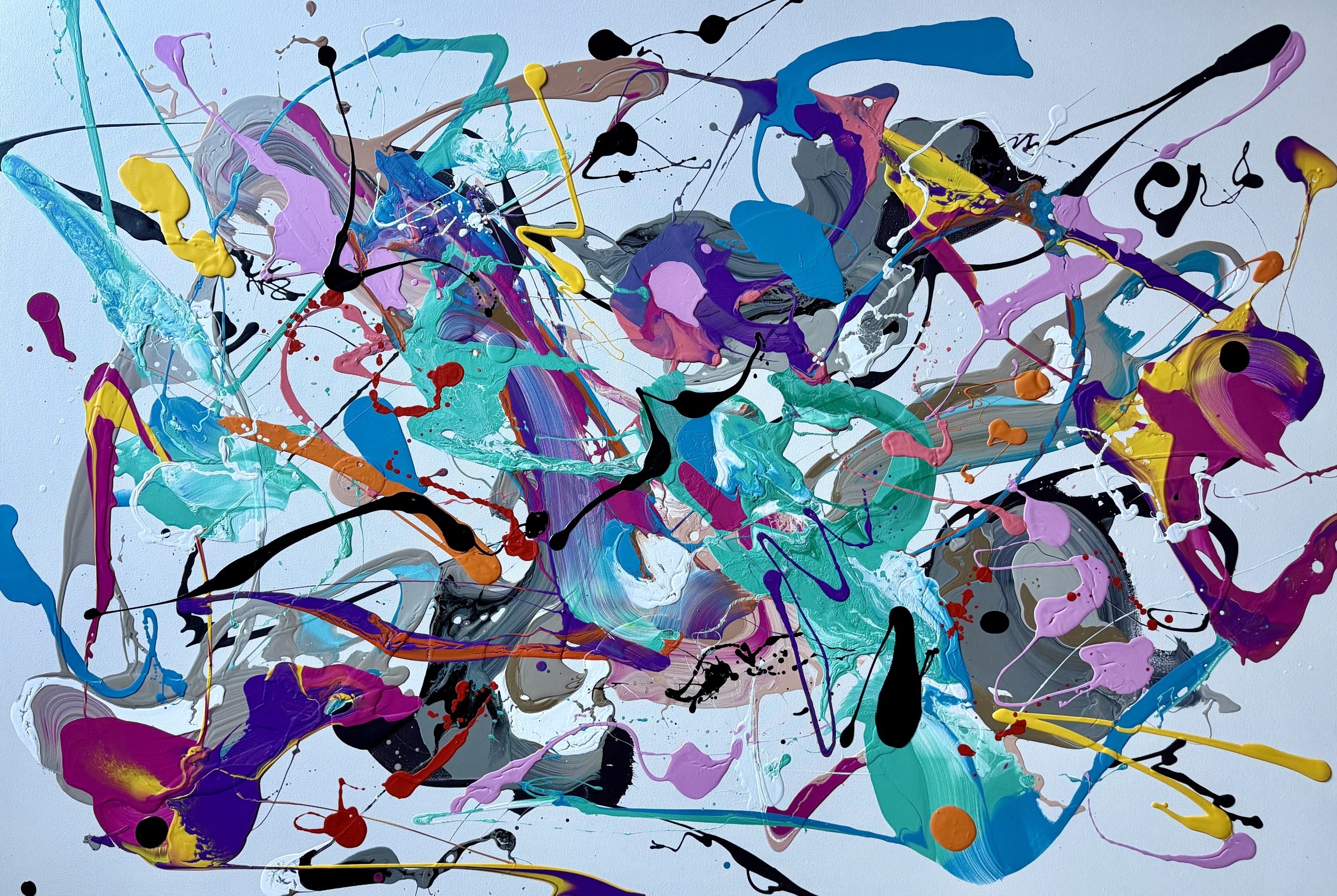 This piece features a composition of carefully arranged organic shapes that orchestrate a narrative of conflict and harmony, fragments of contrasting colours created through blending brushstrokes, abstract signatures and sculptural like curves.