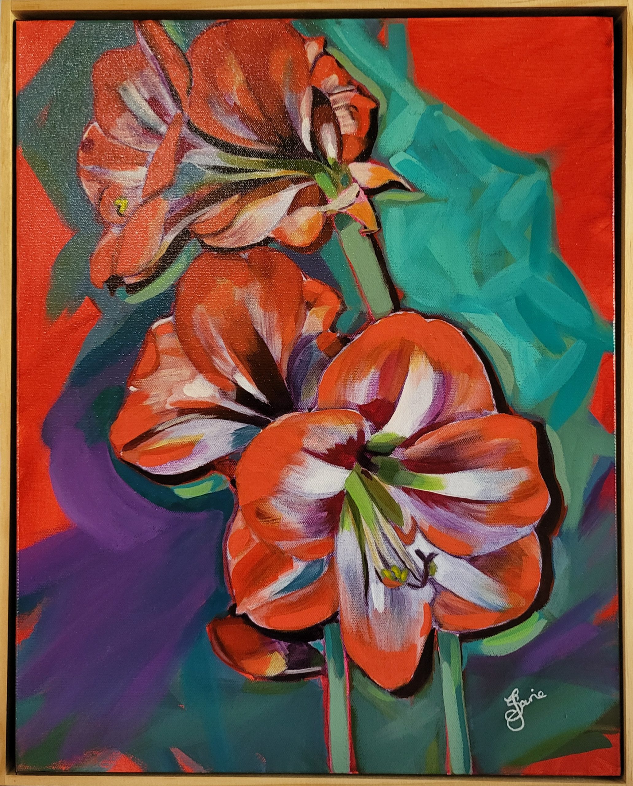 This is an acrylic painting on canvas. It is framed (wood frame) and ready to hang with d-hooks and wire. This artwork is sealed with a gloss varnish.