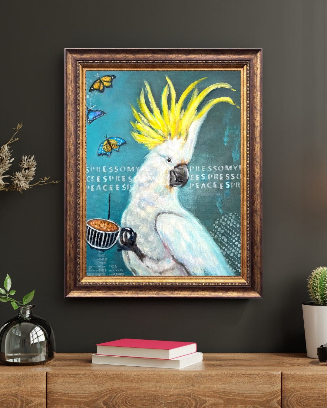 Take a breath, slow down, and savor the moment with Espresso My Peace, an original oil painting from my Brew and Bird series. This piece features a serene white cockatoo gently holding a warm cup, a symbol of quiet joy and simple rituals.