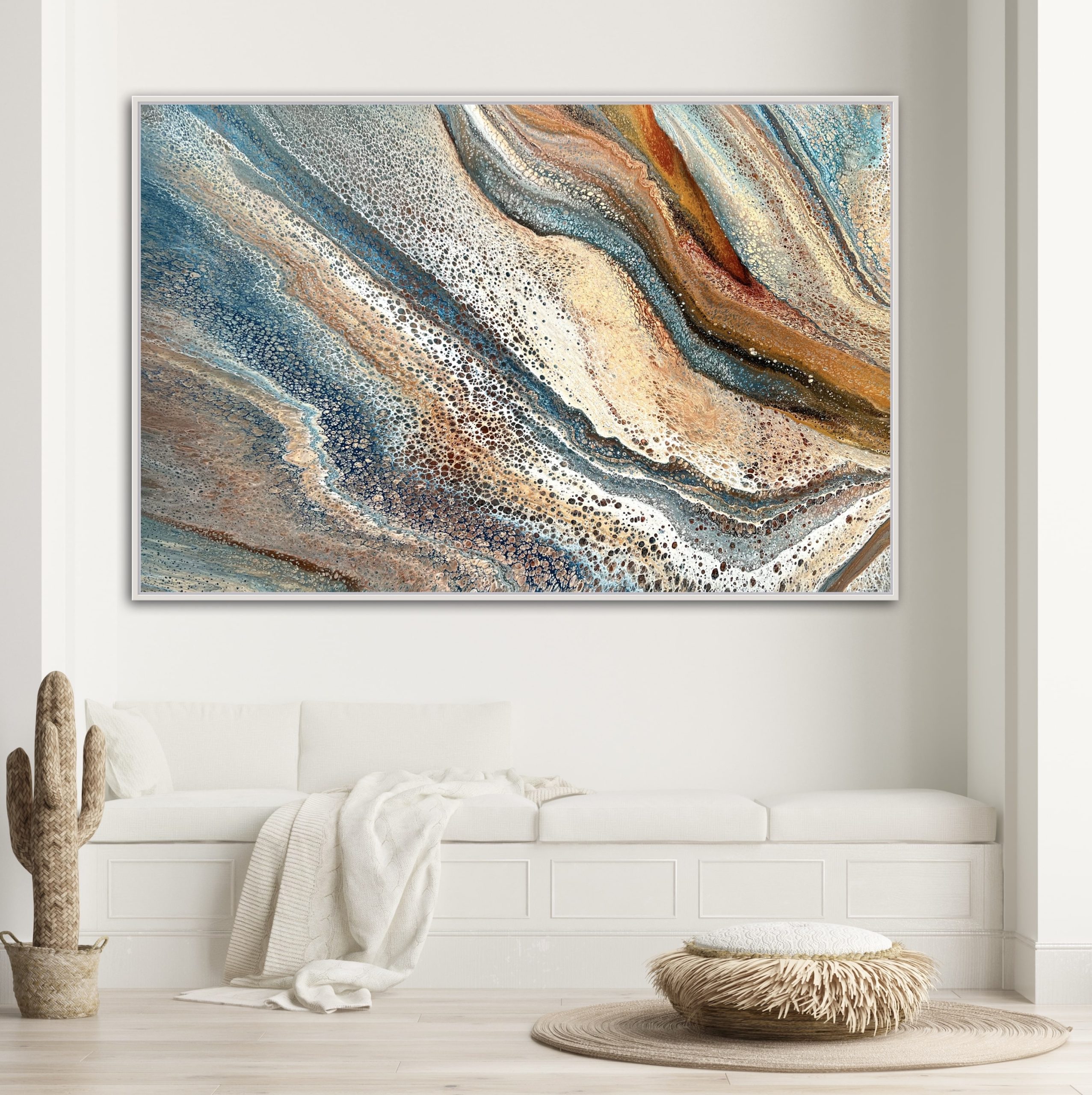 Essential Elements was created using various techniques combined to allow increased flow, interaction and separation of colours to create interesting patterns where pops of colour can be seen emerging from underneath. This added dimension adds lace and cells to the artwork creating an interesting and one of a kind painting that can never be replicated. A lovely variety acrylic pigments were used including metallic yellow & rose gold, bronze, silver, grey, tan, cream, copper, blues, yellow, black and white.