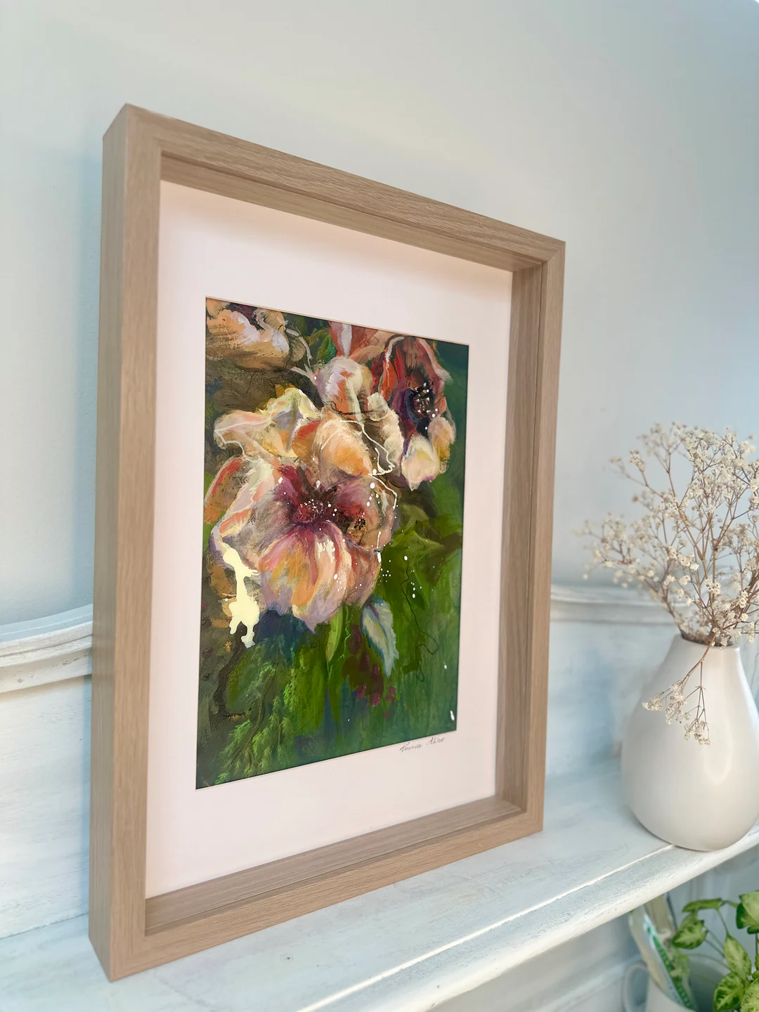 Framed in beach wood look frame, size including frame 32cm (w) x 44cm (h)