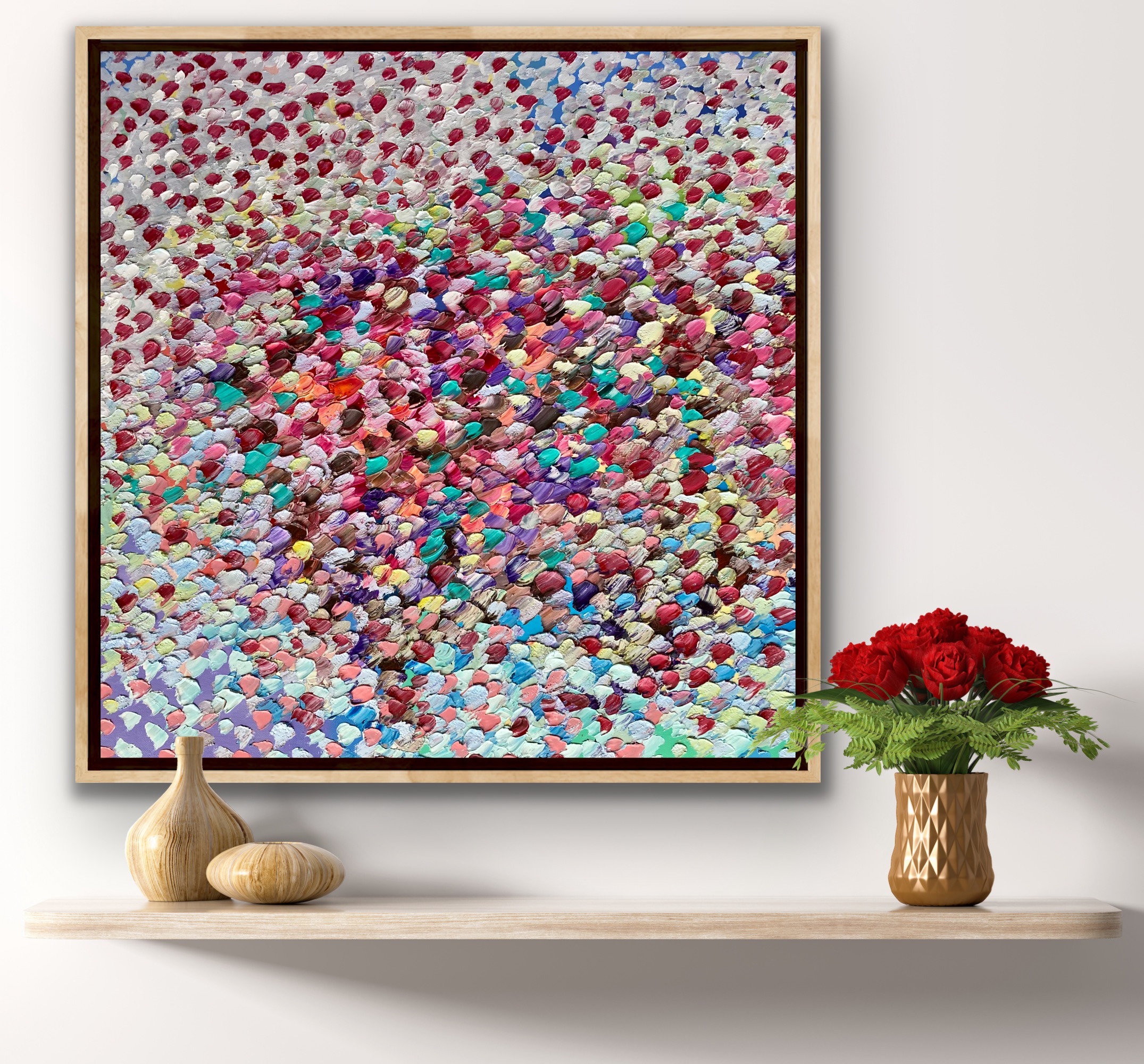 Eternal Love by Theo Papathomas  a painting of beautiful bouquet of coloured petals creating two love Hearts the landscape. Petals are painted in thick rich oil paints with a pallet knife to capture the richness of the colours of the petals and to give a lot of depth to the painting. Weeping petals from the forest creating a veil of colours, dancing over the land. Hope with this s work it makes the viewer feel very peaceful and tranquil. The painting does not come with an external frame.This painting is signed and dated 2022 at the back of the painting and comes with a certificate of Authenticity.