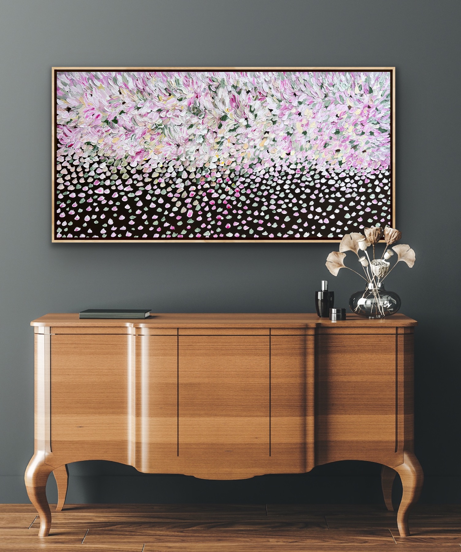 Eternal Love by Theo Papathomas a painting with beautiful soft colours of the petals flying in the wind creating fireworks in the sky. Beautiful petals shining like stars in the sky. Capturing the beautiful colours of magnolia and rose petals creating a beautiful bouquet against the dark sky. Petals weeping onto the landscape creating this beautiful veil of colours covering the whole sky . A composition of colours and rhythms of petals dancing like musical notes creating fireworks in the sky . The painting is painted with a palette knife with so much texture. A very peaceful and tranquil painting with so much depth . The painting does not come with an external frame. The painting is signed and dated 2023 at the back and comes with a certificate of Authenticity.