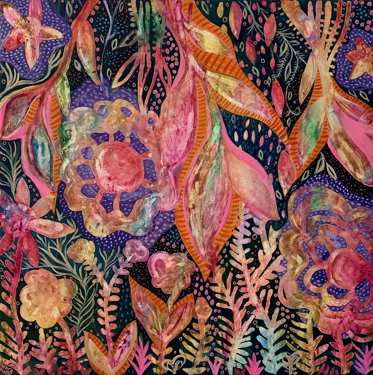 This artwork is an original abstract using watercolours and acrylic paint on beautiful polycotton canvas. Creating this bold and bright artwork was a delight! Tropical summer vibes featuring abstracted blooms with trailing vines featuring gorgeous colours of paradise such as hues of red, pinks, orange, purple ,yellow and hints of green. The use of contrasting transparent texture of the watercolour paint with darker blue and green background along with interesting patterns and fine details creates a vibrant and alluring showstopper that will lift any mood and space.