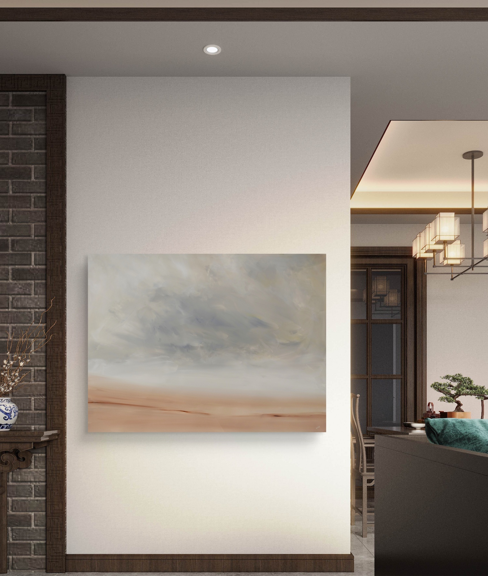 “Eternity Lost” is an evocative acrylic landscape that captures a sense of infinite desolation and fleeting time. The composition features a vast, overcast sky dominated by swirling layers of soft gray clouds, blending ethereal wisps of silver and charcoal in a dreamlike haze. These turbulent yet muted heavens gradually fade into a distant horizon, where they meet a serene expanse of warm beige terrain—reminiscent of endless dunes or a forgotten shoreline. The subtle gradients and minimalistic palette evoke a profound solitude, as if the passage of eternity has eroded all vibrancy, leaving only the quiet interplay of sky and earth. This piece invites contemplation on loss, transience, and the boundless unknown.