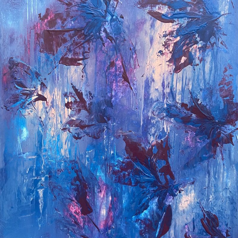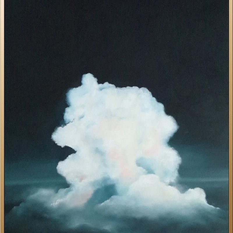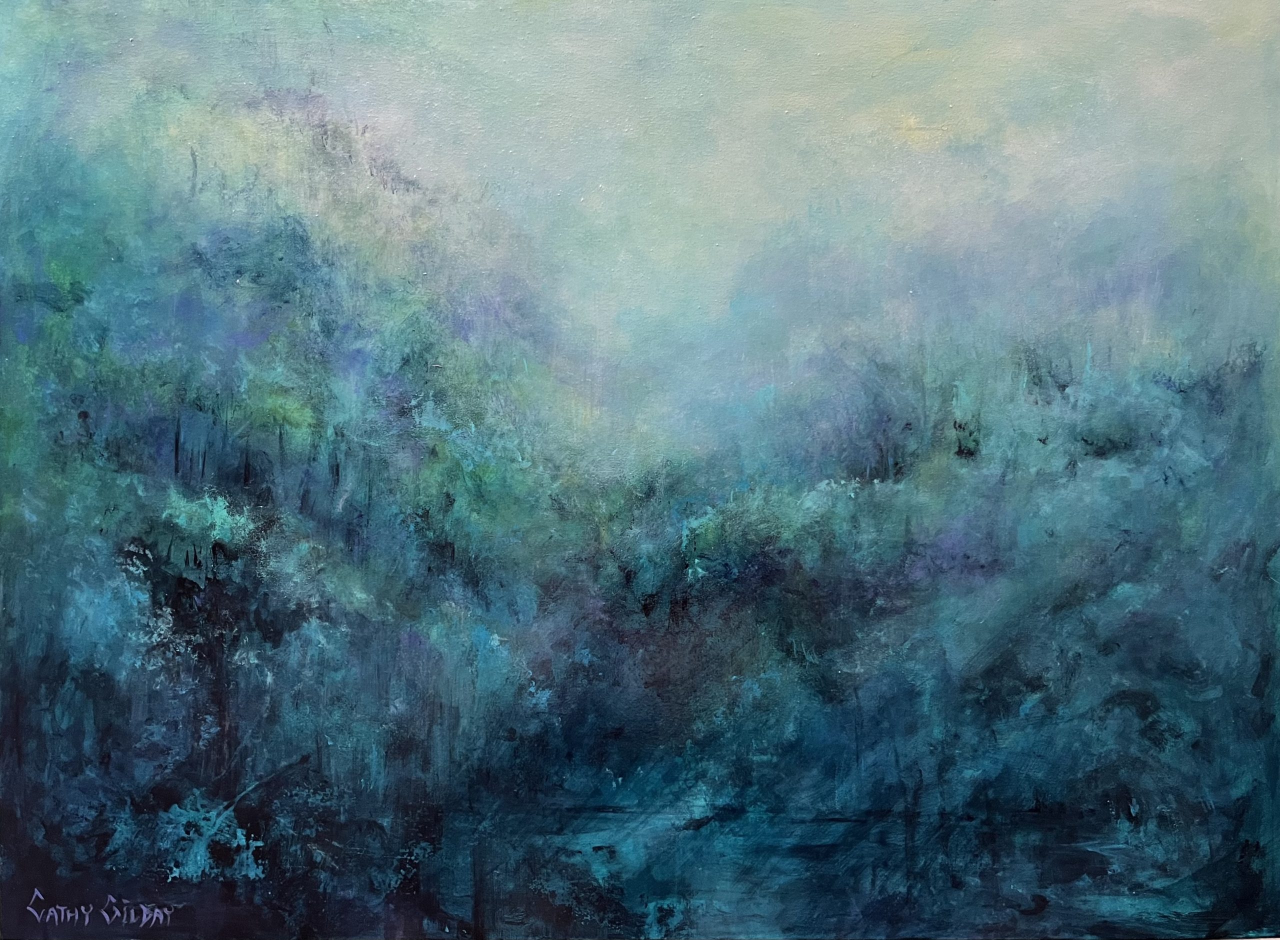 An intuitive piece, with a quiet, understated palette, that suggests a peaceful & meditative ambience. When I began, I had no definite idea of subject, more a feeling that I wanted to express, or perhaps even a place where I would want to be. The soft gossamer mist adds an element of mystery and tranquility.