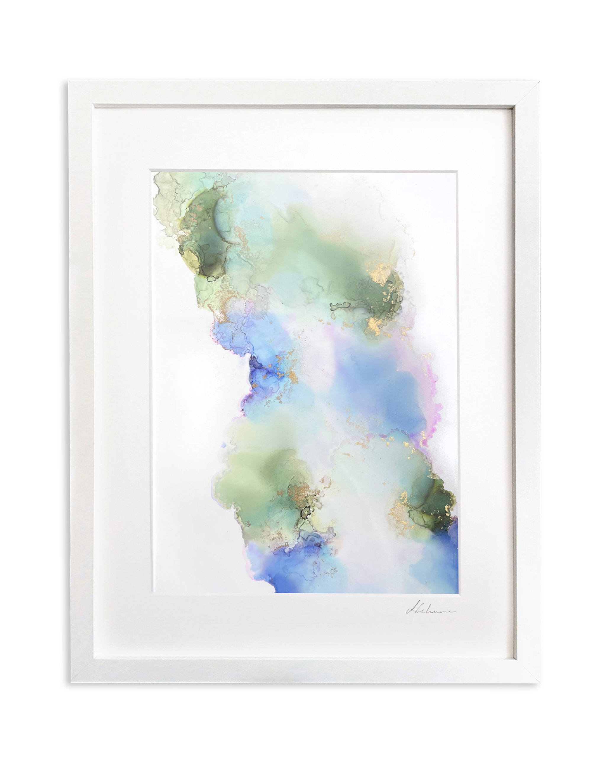 In this enchanting piece, soft moss and cool peri colours blend seamlessly with delicate hints of salmon, creating a mesmerising symphony of hues. Gentle rivers of gold flow through the artwork, adding a touch of opulence and depth. Crafted with the fluid beauty of alcohol inks, this creation evokes a sense of calm and wonder.