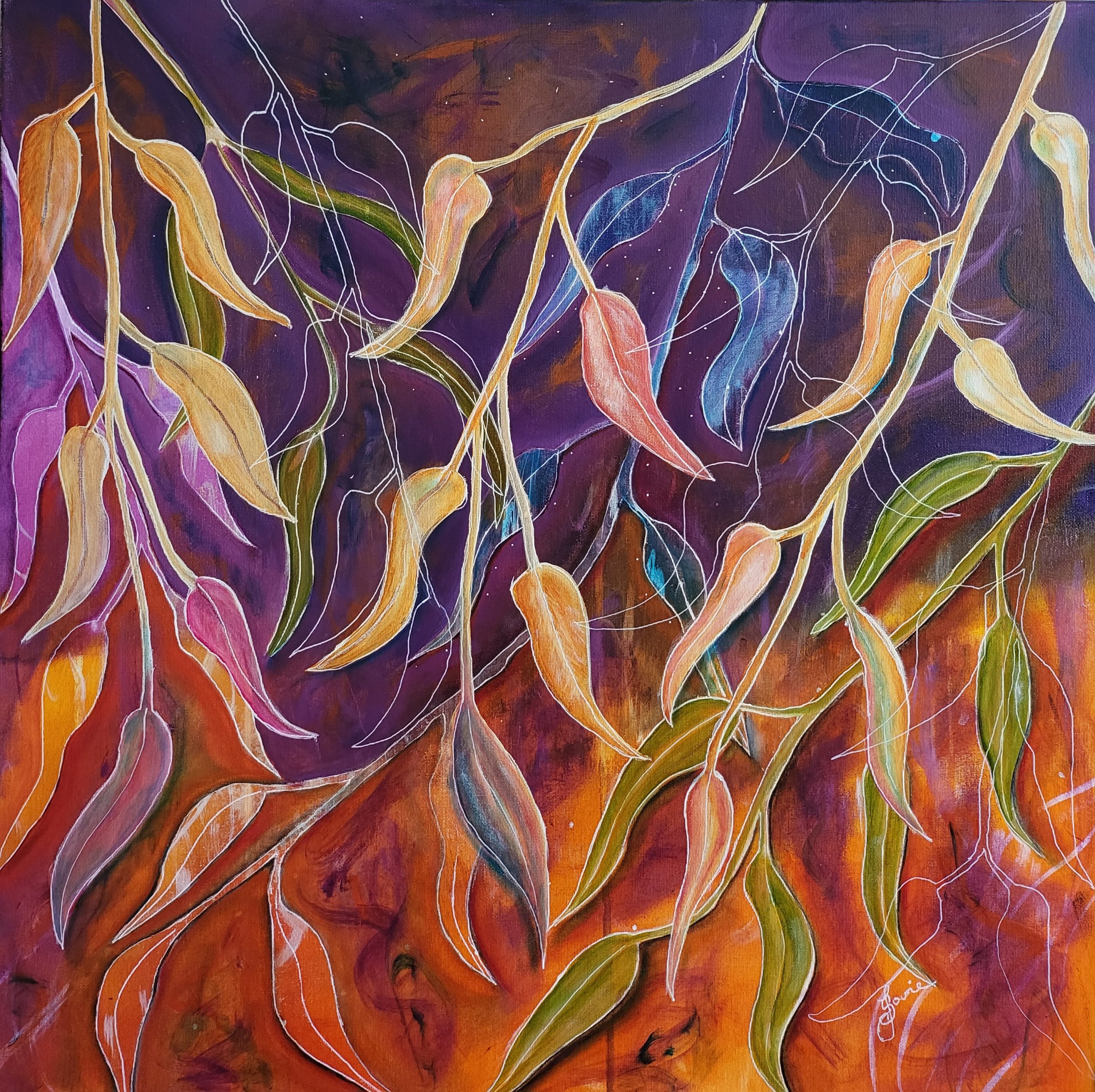 It’s easy to find inspiration amoung the Eucalyptus trees in Australia. This artwork captures the essence of these iconic leaves, infusing them in a kaleidoscope of colours, that reflect the diversity and beauty of the Australian landscape.
