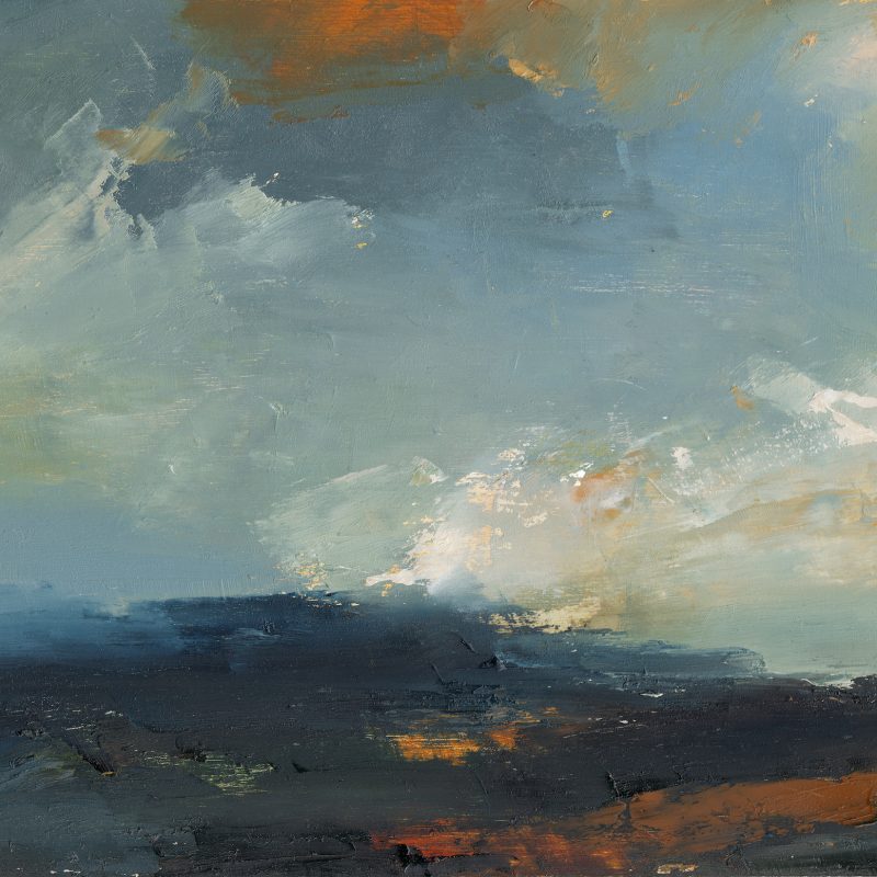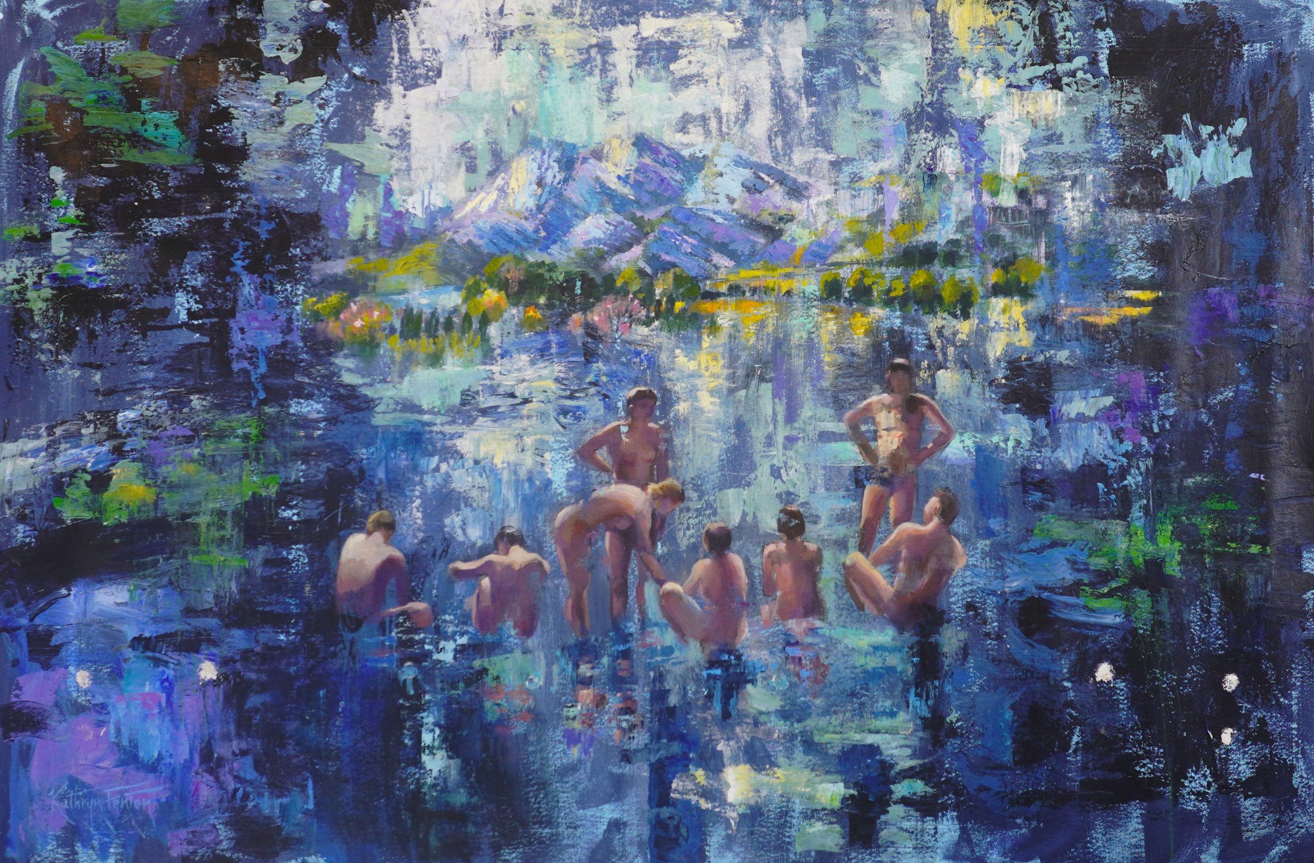 This work was painted with several layers of textured tones. The backlit figures bathe in the euphoric light of late afternoon.