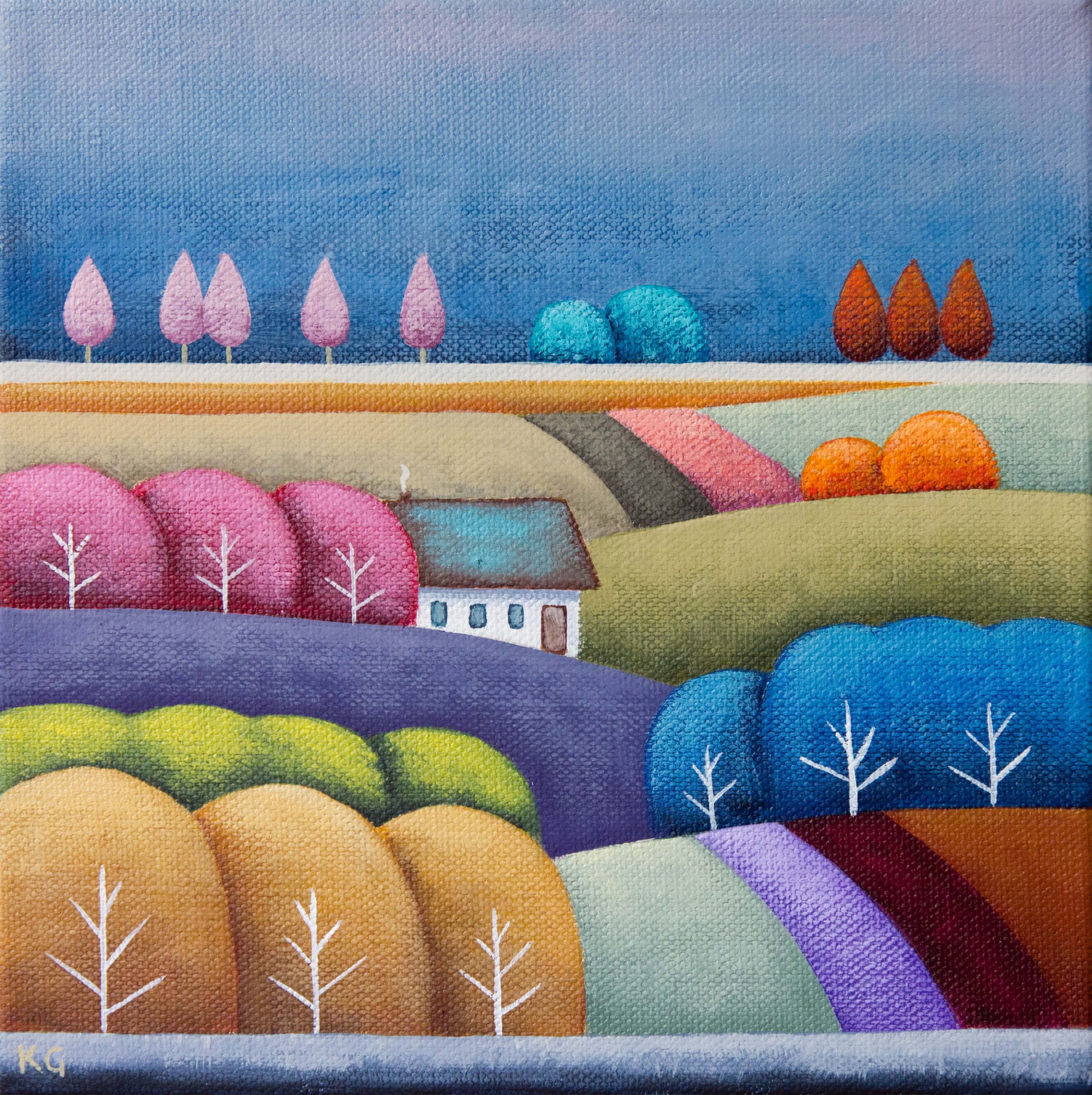 This small, square landscape scene depicts a rural scene of rolling hills and cultivated fields. Interspersed throughout are yellow, pink, blue and green trees plus a house nestled among them. Painted in a charming, naive style. This piece would make a colourful addition to an art collection and is perfect for those smaller spaces. Wire on the back ready to hang, sides painted in a continuance of the composition so no need to frame, but would look great in a natural wood floating frame.