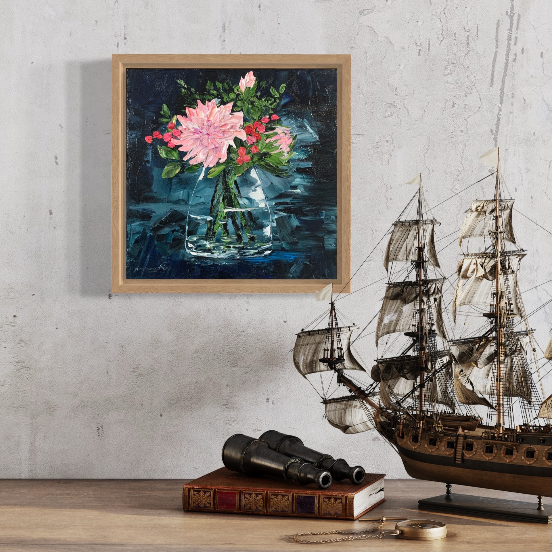 This heavy textured artwork is made using impasto technique with palette knife and is framed in natural floater frame, ready to hang.
