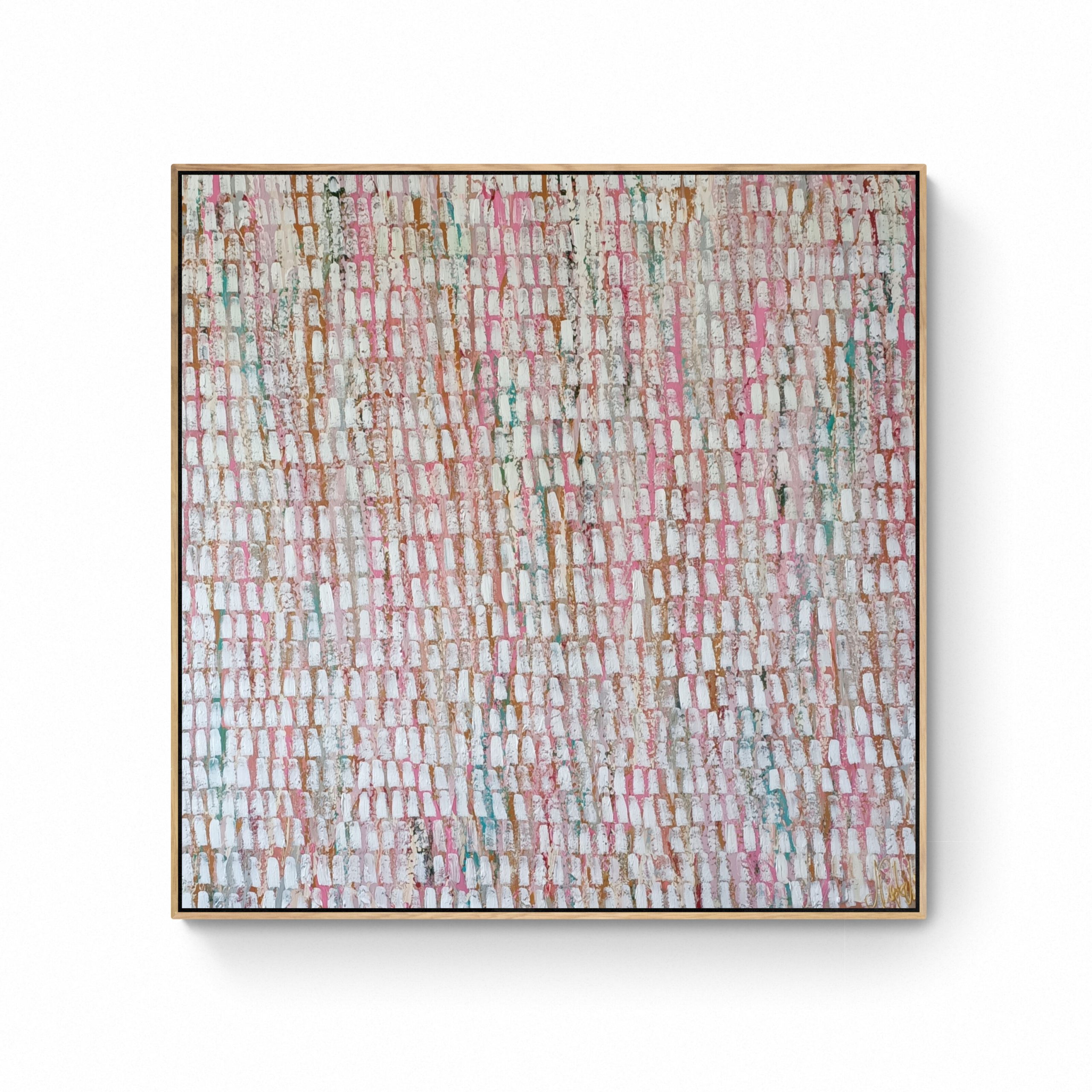 Painted on Belgium linen and built up in layers. Warm romantic colour palette then overlayed with Natalie’s signature white lines. They represent spirit, light, optimism.