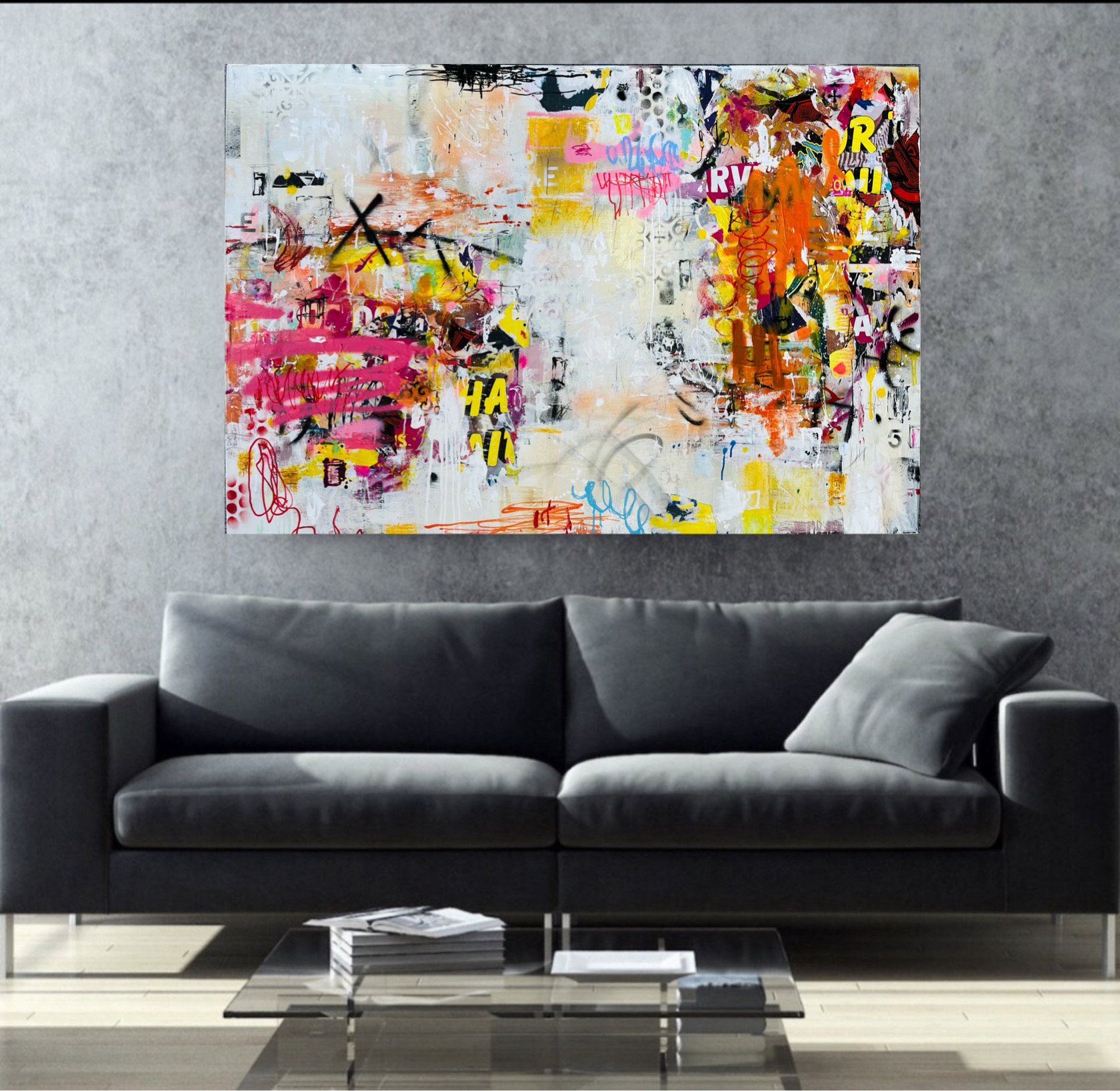 The artwork is an Abstract Statement piece and will give maximum impact to any room. My art is directly influenced by Graffiti in City Laneways, Vintage Billboards and other weathered surfaces. This piece is also inspired by my love of gestural abstraction and my obsession with using spray paint.