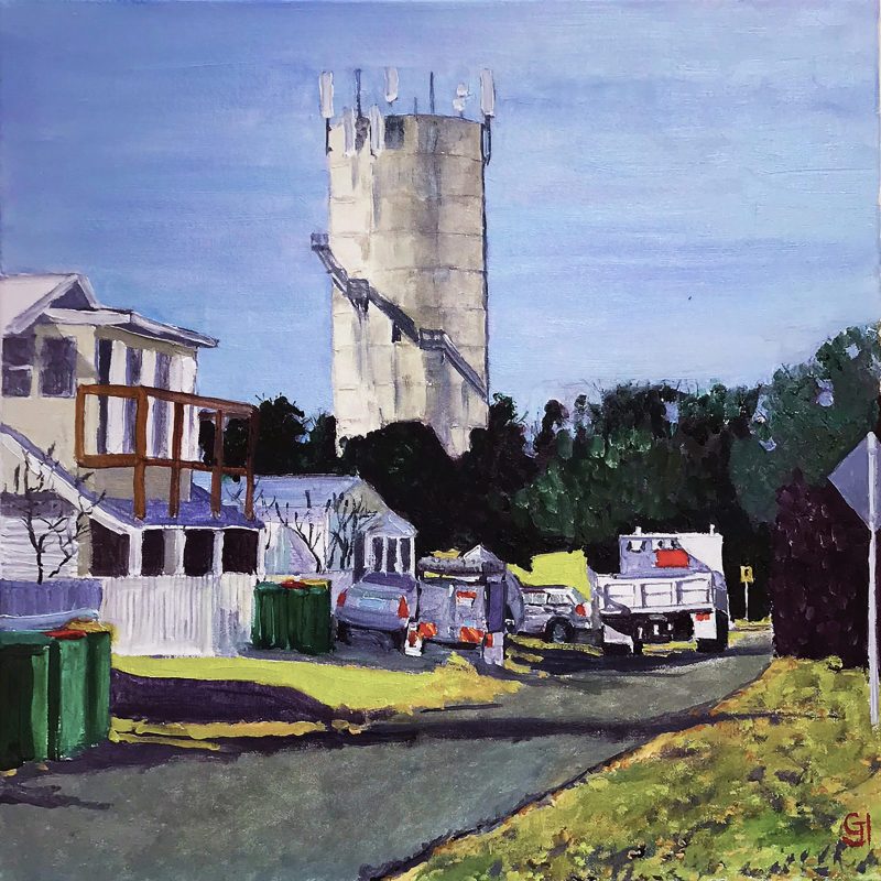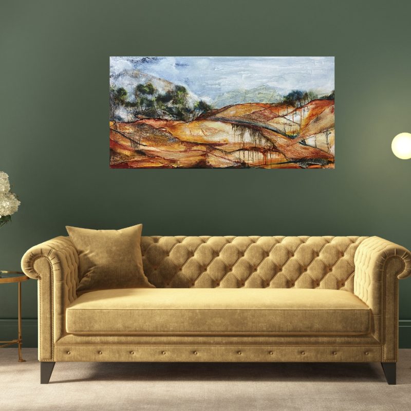 This is an original painting by Sigrid Patterson, acrylic on canvas with a painted and waxed Tassie box frame. The painting extends beyond the canvas and on to the frame encouraging the viewer to think beyond the box.