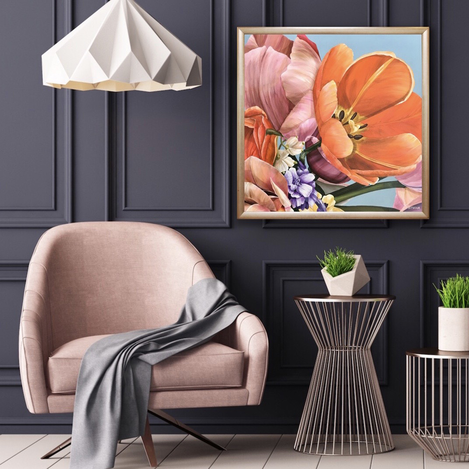 Quality acrylics used giving long lasting rich pigmentation/lustre. Designed on acid free environmentally unbleached cotton duck, triple coated with universal primer and gallery style folded corners. Protective Matte Varnish applied to protect work.