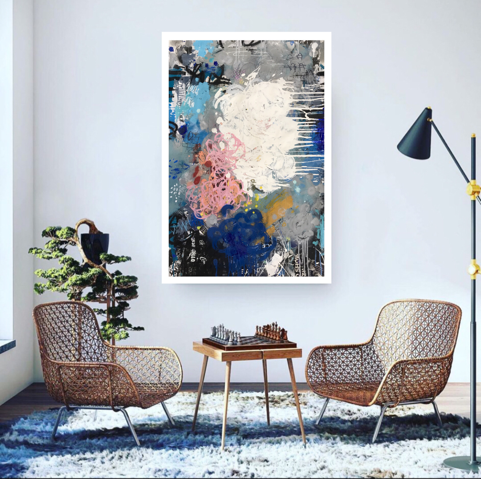 The Painting has a very textured finish created by built up layers, a visual effect mimicking the look you would see in the street where this effect is created over time on Graffiti Walls & Advertising Spaces.