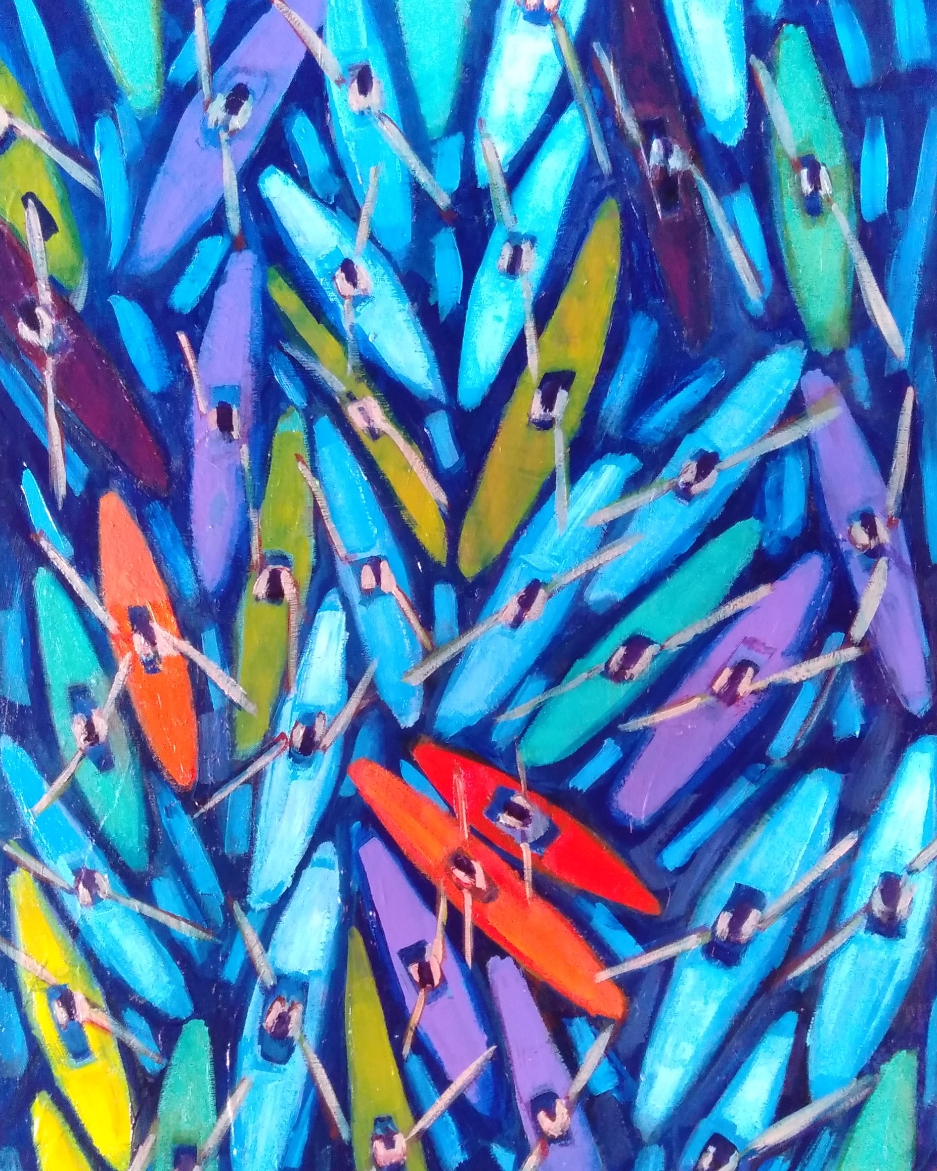 Every which way by Angela Mulligan. Aerial view of kayaks meetup on a Sunday. Bold bright colours and abstract shapes used to capture the pattern of the kayaks weaving every direction to find a spot. Will enhance any wall in your home or office