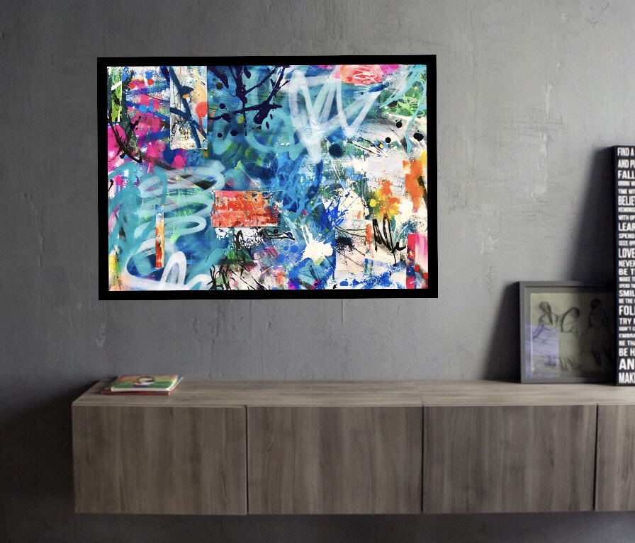This artwork has a textured finish created by built up layers, paint splatters and torn paper, a visual effect mimicking the look you would see in the street where this effect is created over time on Graffiti Walls & Advertising Spaces. These imperfections are part of the overall look and feel of the finished work.