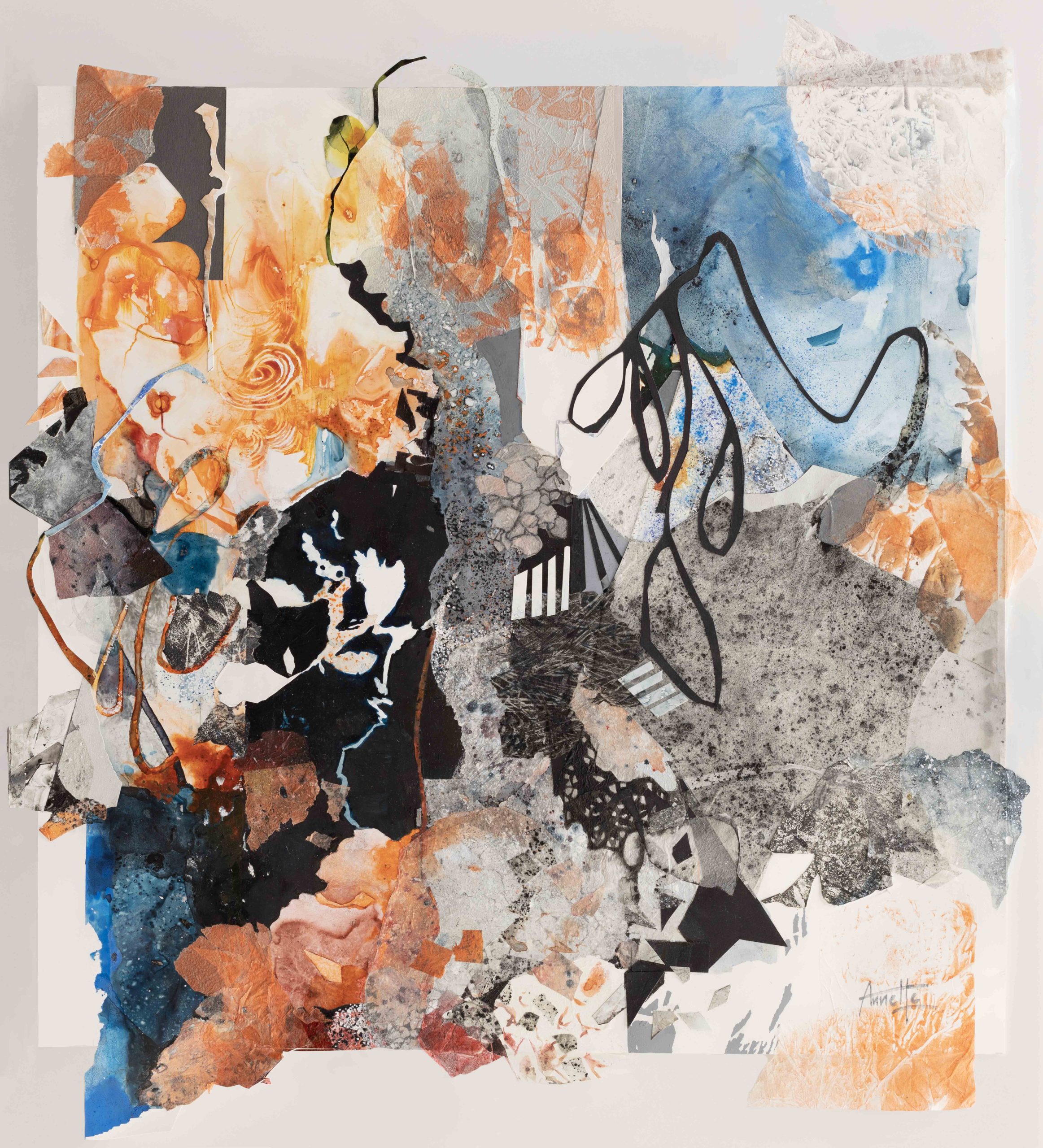 I describe this as one of my painted, collaged, explosive arrangements, where I use a an amalgam of techniques and mediums including intricate pencil drawings, mono-printed textures and painted pieces in a process of deconstruction and reconstruction.