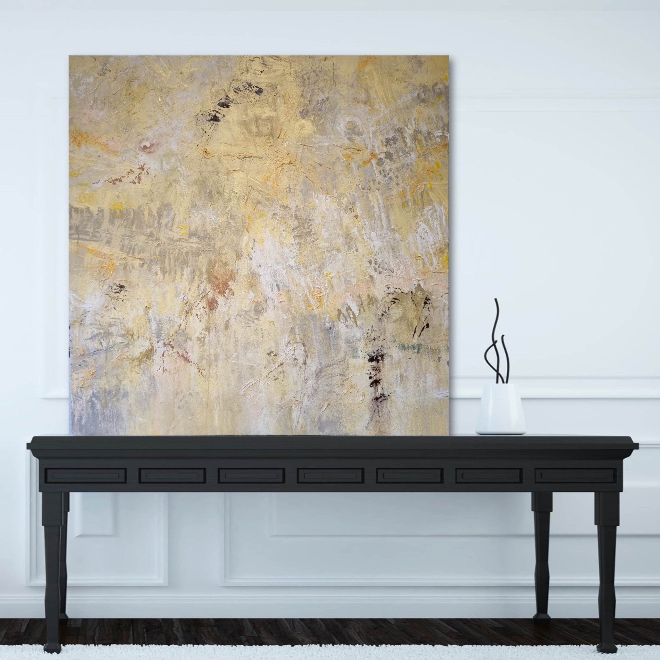 This painting is finished with a modern soft satin protective finish and matte white edges. It’s feel within a room is dynamic and decorative, yet holds a grounding and calming effect, sure to make an appealing feature, at home equally in a domestic interior or corporate space.