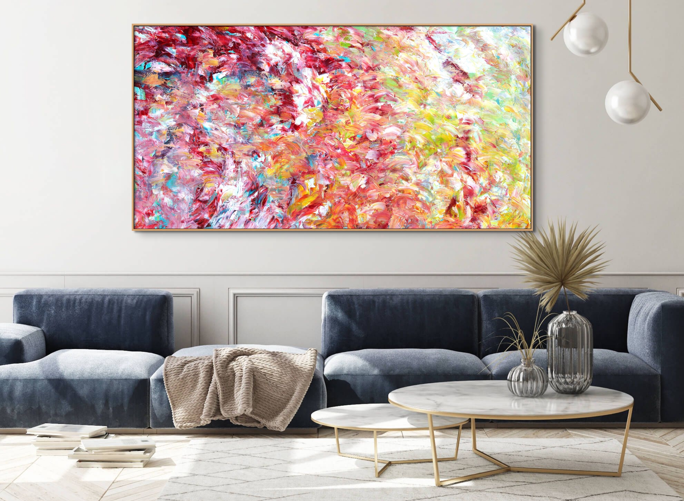 This artwork is painted on professional-grade canvas stretched and sealed with varnish. The canvas is 196 cm in width by 100 cm in height. The sides are painted in the same colours as the surface, so it does not need a frame. The image shown has a floating frame, purely for illustration purposes.