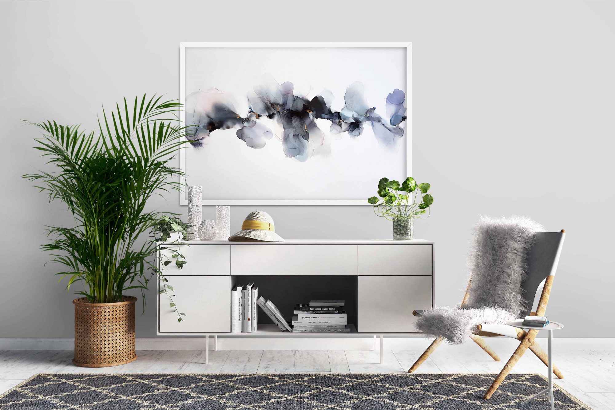 ‘Exhale’ is an original artwork created with tints and shades of black, soft purple, blue, grey, soft blush pink and metallic brass.