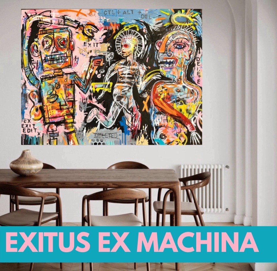Grab a blender and add some pop art, expressionism, street posters, spray paint, stencils, ideas about robots and out of control Al taking over the world, and you will end up with an artwork that looks something like this, a Neo Pop statement piece and will give maximum impact to any room.