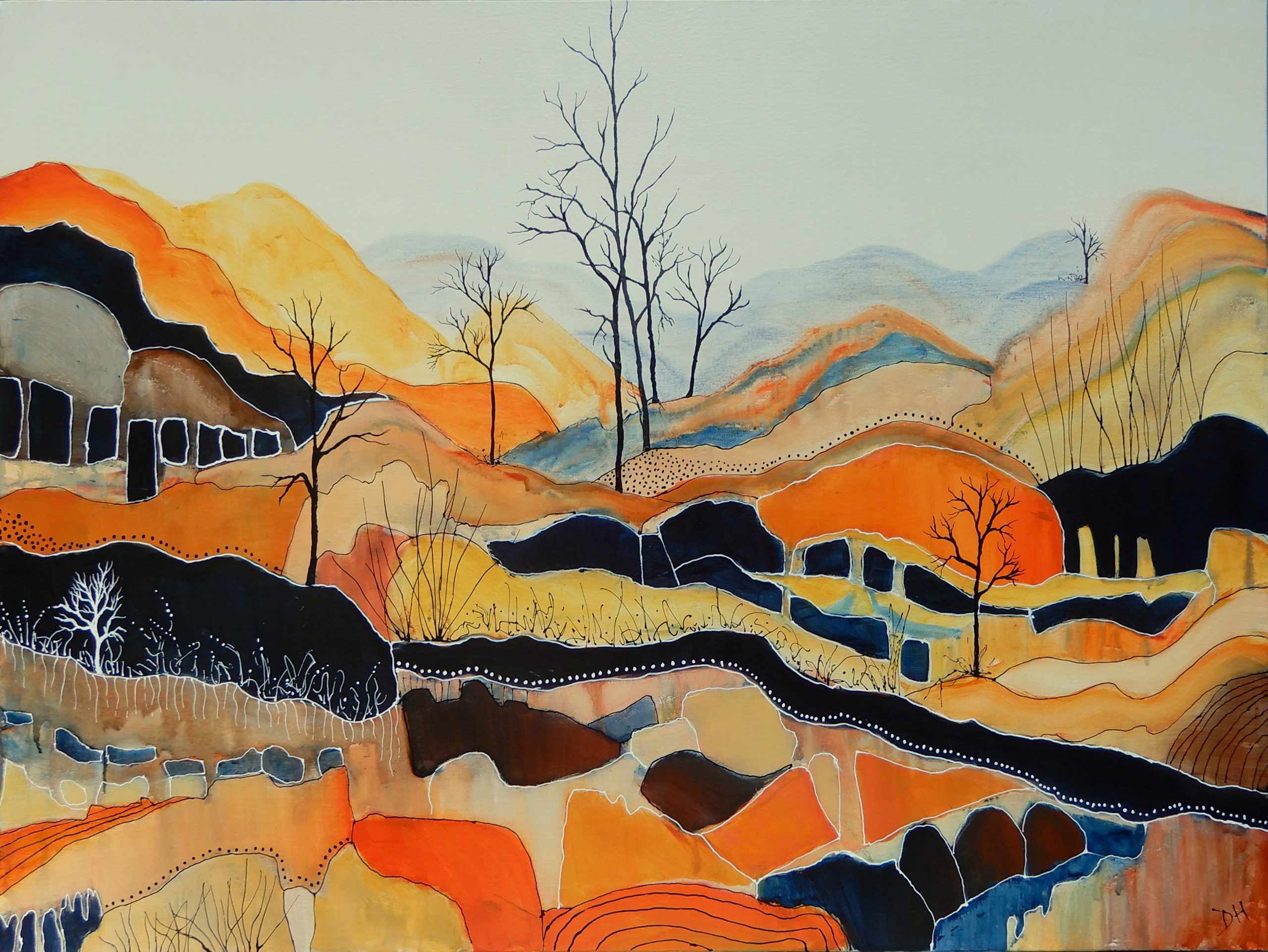 Inspired by country in the NT, this bold, bright painting explores the rhythms and colours of the landscape, rich with hills and ridges, and vibrant earthy tones.