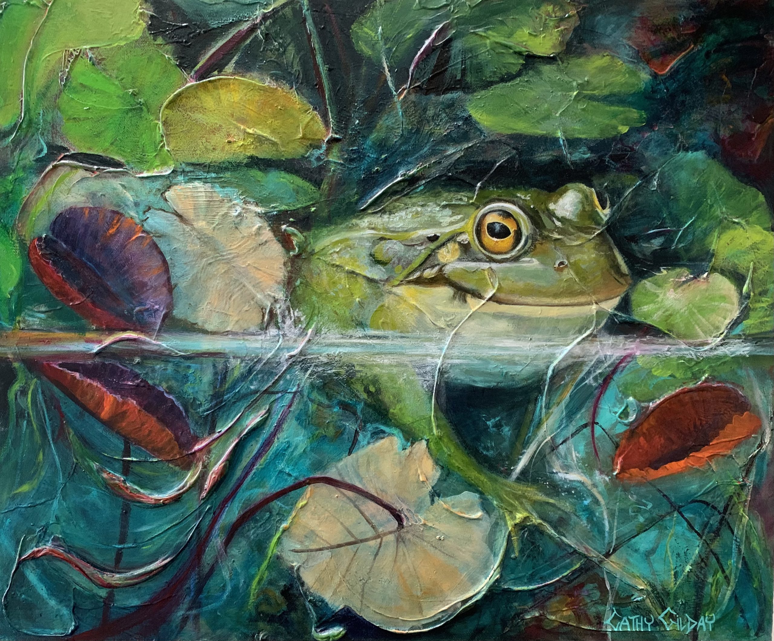 My intention in this piece was to have this bold green fellow, lurking in amongst the lily pads, semi submerged in water. To begin, I used a heavily textured canvas with an abstract background and just as things sometimes go, even with the best plans, I did have some challenges ( hence the title:) but was thrilled with the final result. ‘F’ is for frog, is a bold vibrant painting which would be great for nature lovers or a kiddies room.