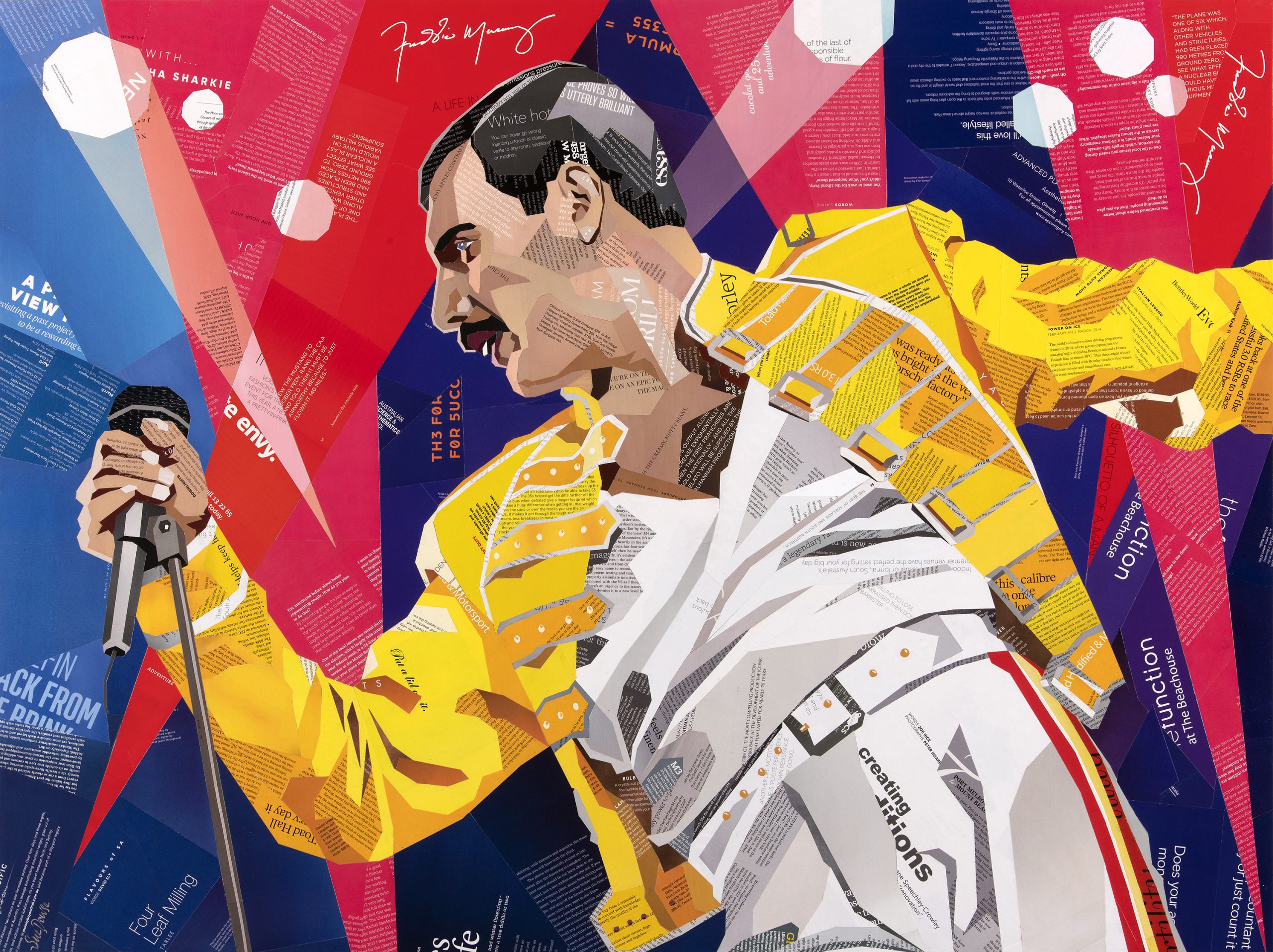 Remember when Freddie Mercury wore his yellow jacket at Wembley Stadium. The year was 1986 when the jacket made its debut during Queen’s ‘Magic’ tour. What a magical one-of-a-kind collage to showcase this momentous occasion. Notice the ‘Freddie Mercury’ printed signature as part of the background.