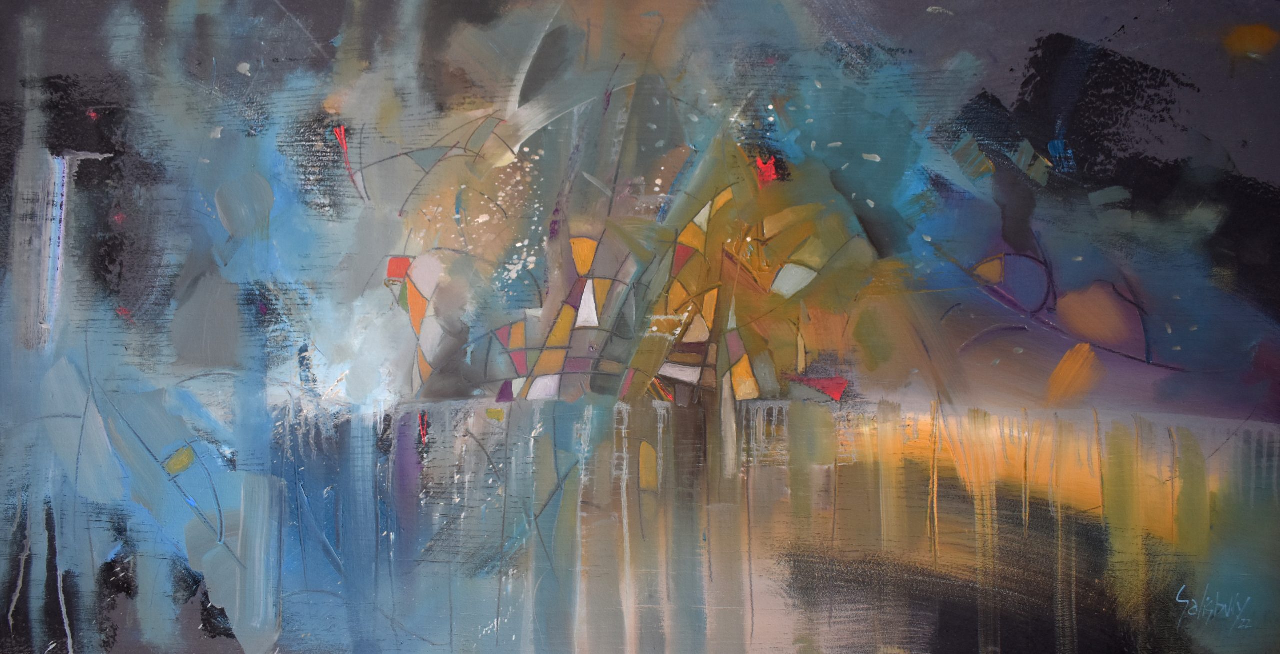An abstract dreamscape with many layers of meaning. The iconic Opera House has delivered many memorable nights full of artistic excellence. Oil on triple gessoed 7mm red oak plywood.