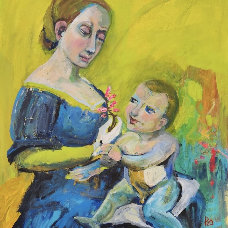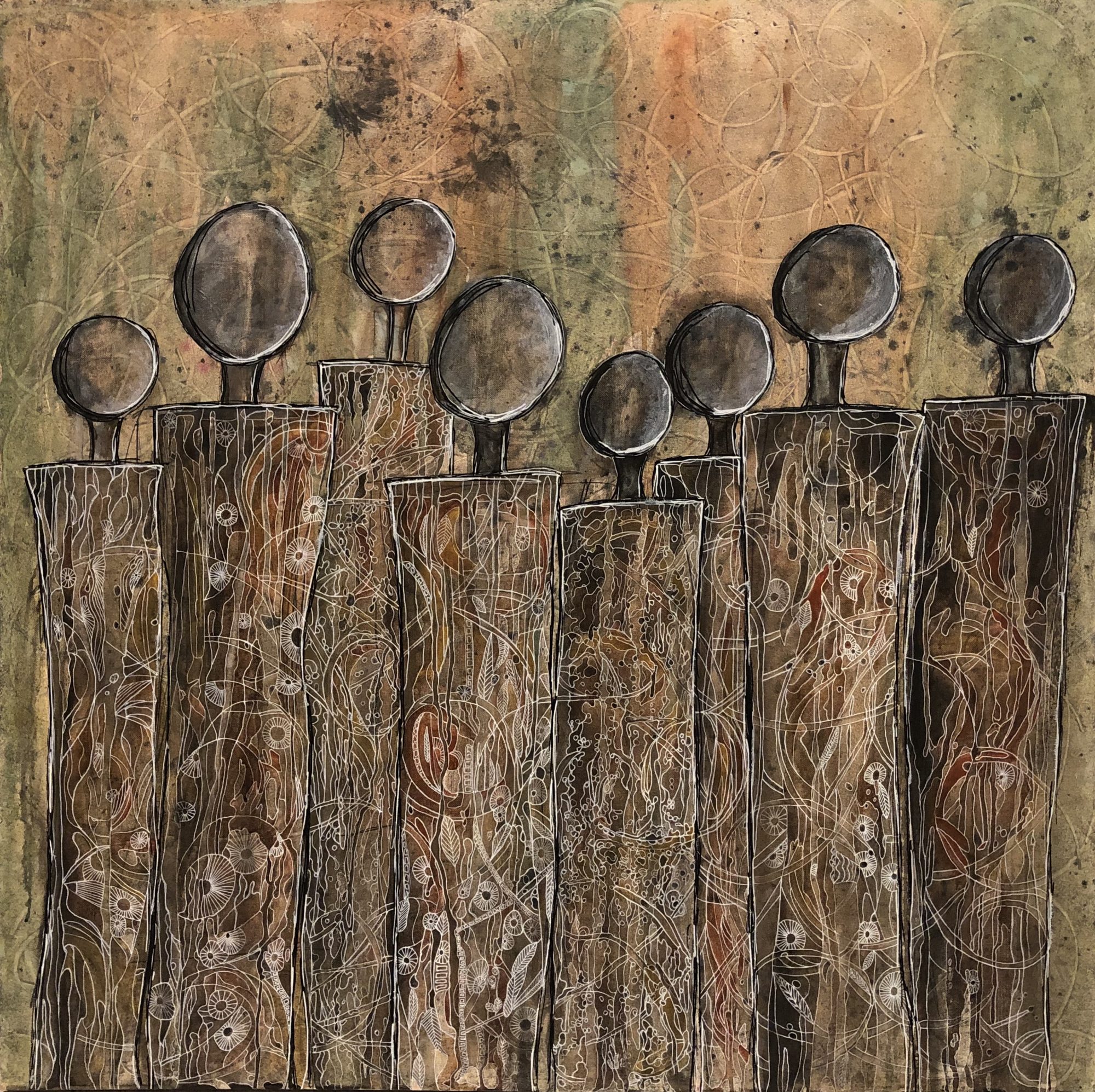 Acrylic pigment powder mixed with a pouring medium and put on the canvas with a roller, swirls added during the drying with a palette knife. Over the top I added the faceless people. No identity, who are they? All similar but also diverse in their own way. Line detail added to each figure.