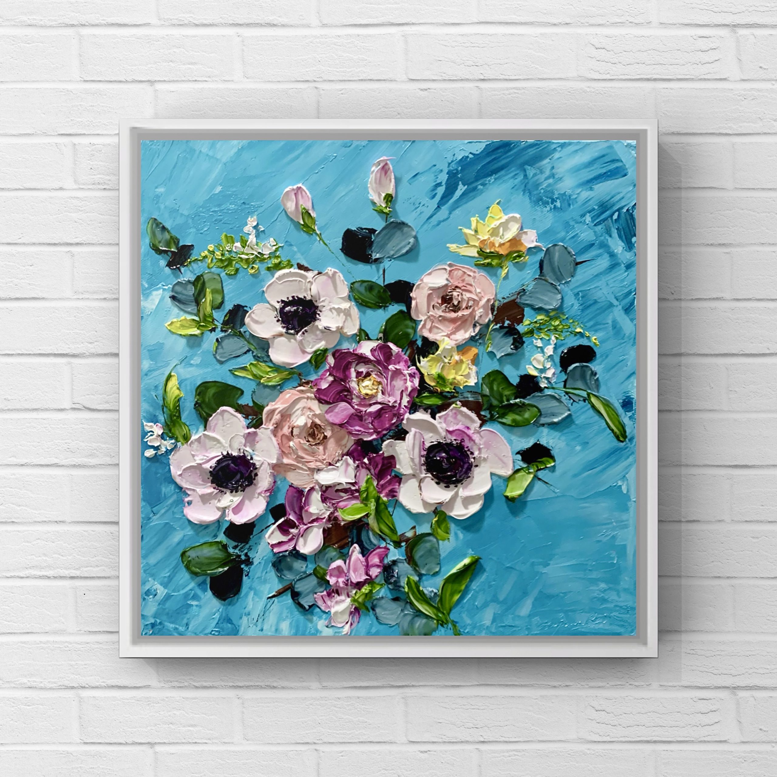 This textured artwork is made using impasto technique with palette knife. The thick textures and layers of paint makes the snow appear more realistic and give a sensory appeal to the artwork. The artwork comes with a certificate of authenticity. It’s framed in white floating frame with wire to hang.