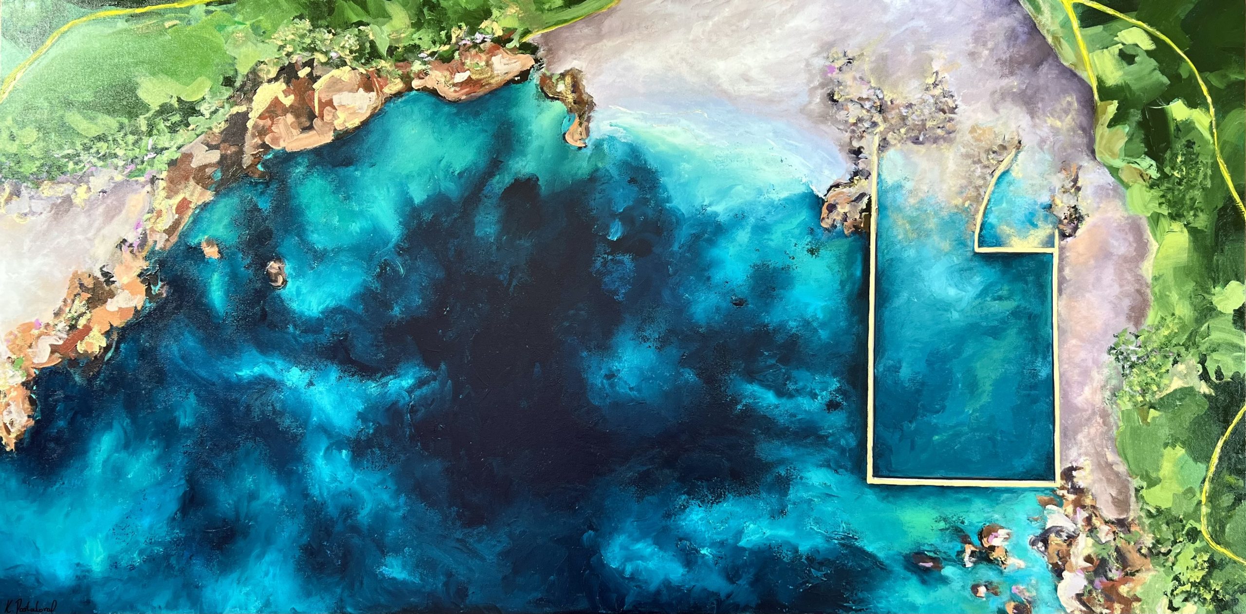 In this painting I wanted to highlight the corals, crystal clear water and the bright greens surrounding the beach.