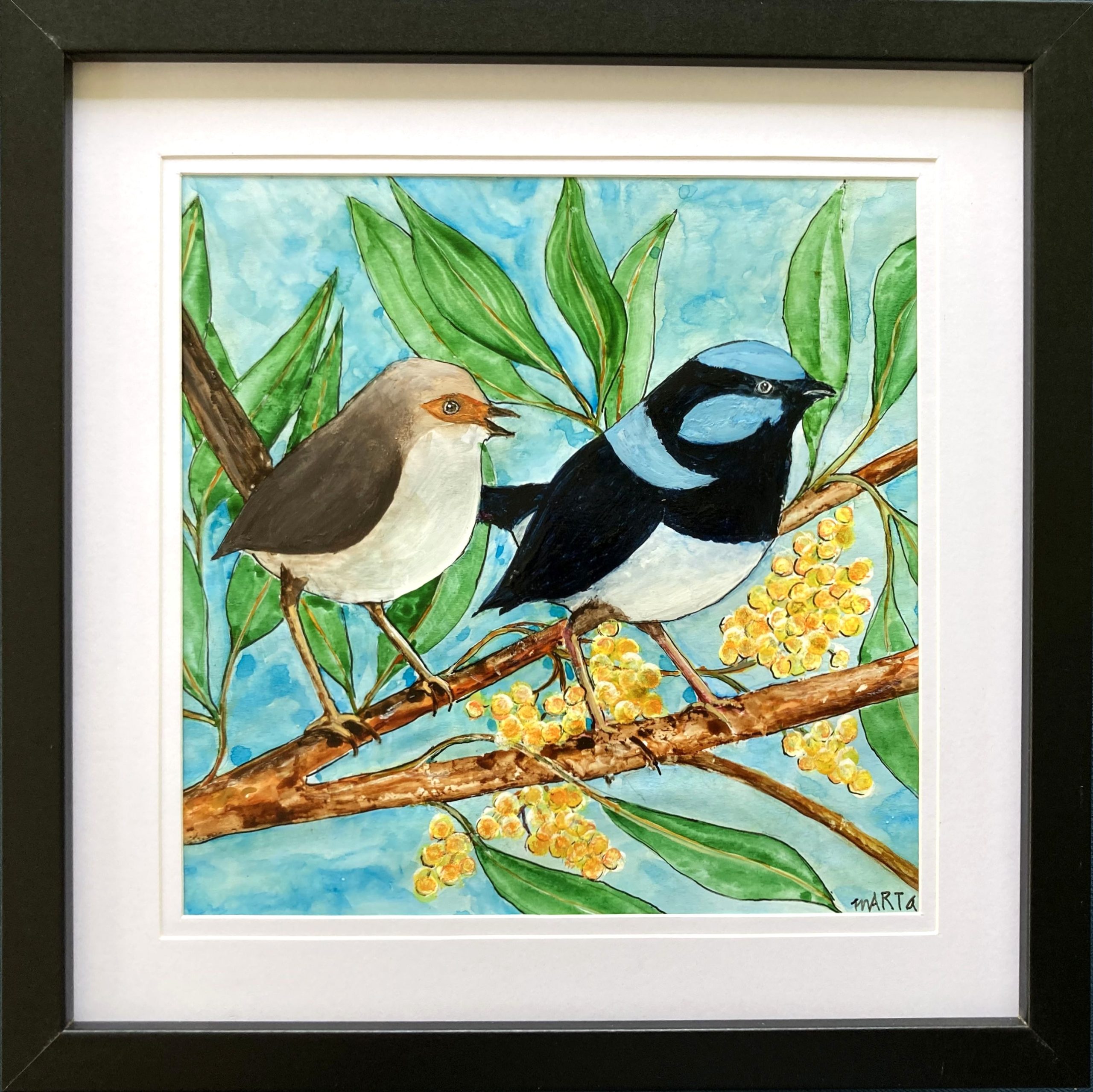 Another painting inspired by the bird life around my home in Forest Lake. These tiny beautiful birds are common around the parks and gardens where I live. They are usually seen in small social groups with one male and several females. The dazzling white, black and blue colours of the male Fairy Wren’s head, neck and tail distinguishes it from the females plain brown and white plumage. They are not shy around people and one can often observe them from close up.