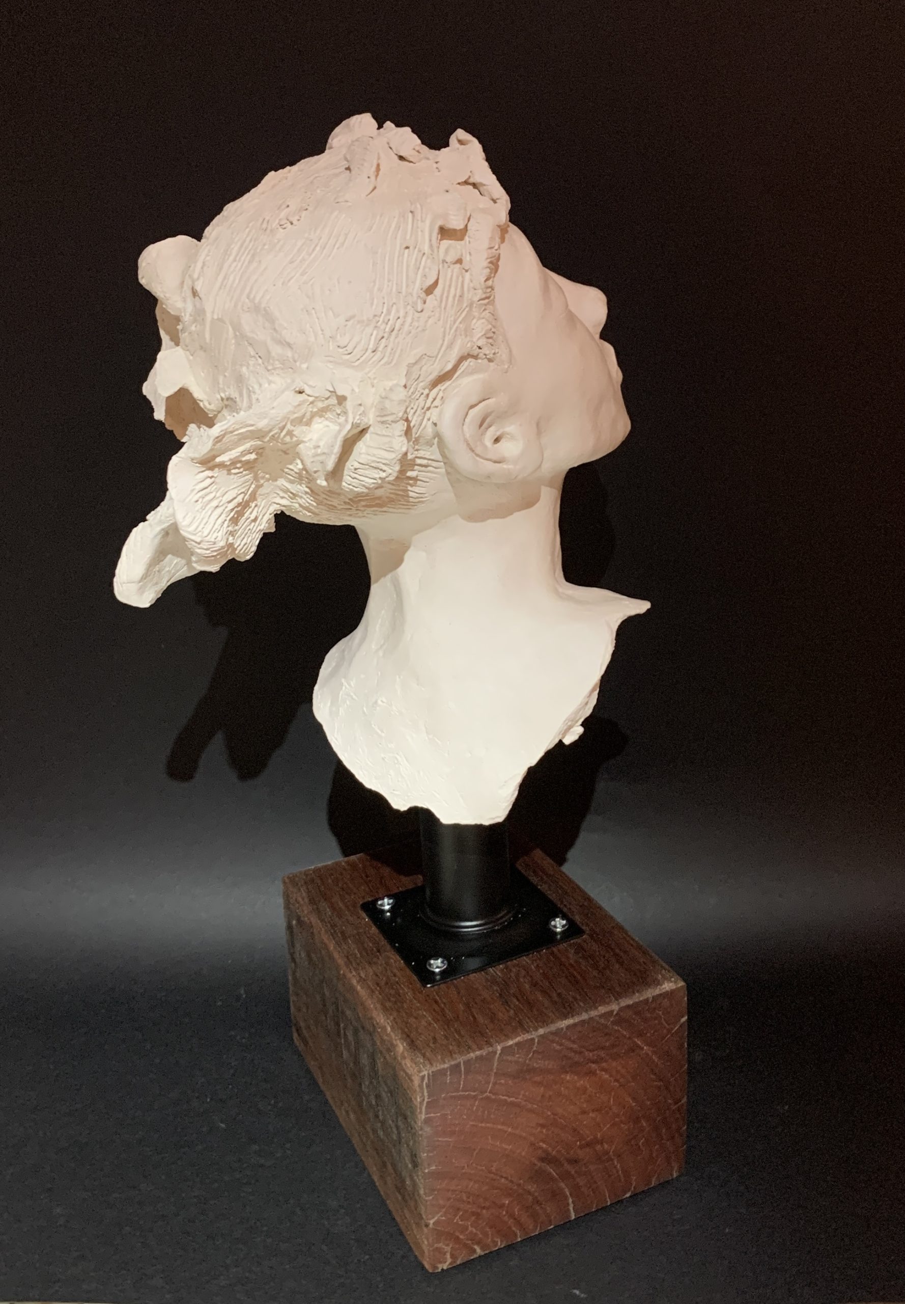 Fallen Woman by Kim Rees – bisque fired hand sculpted female head on Australian hardwood stand.