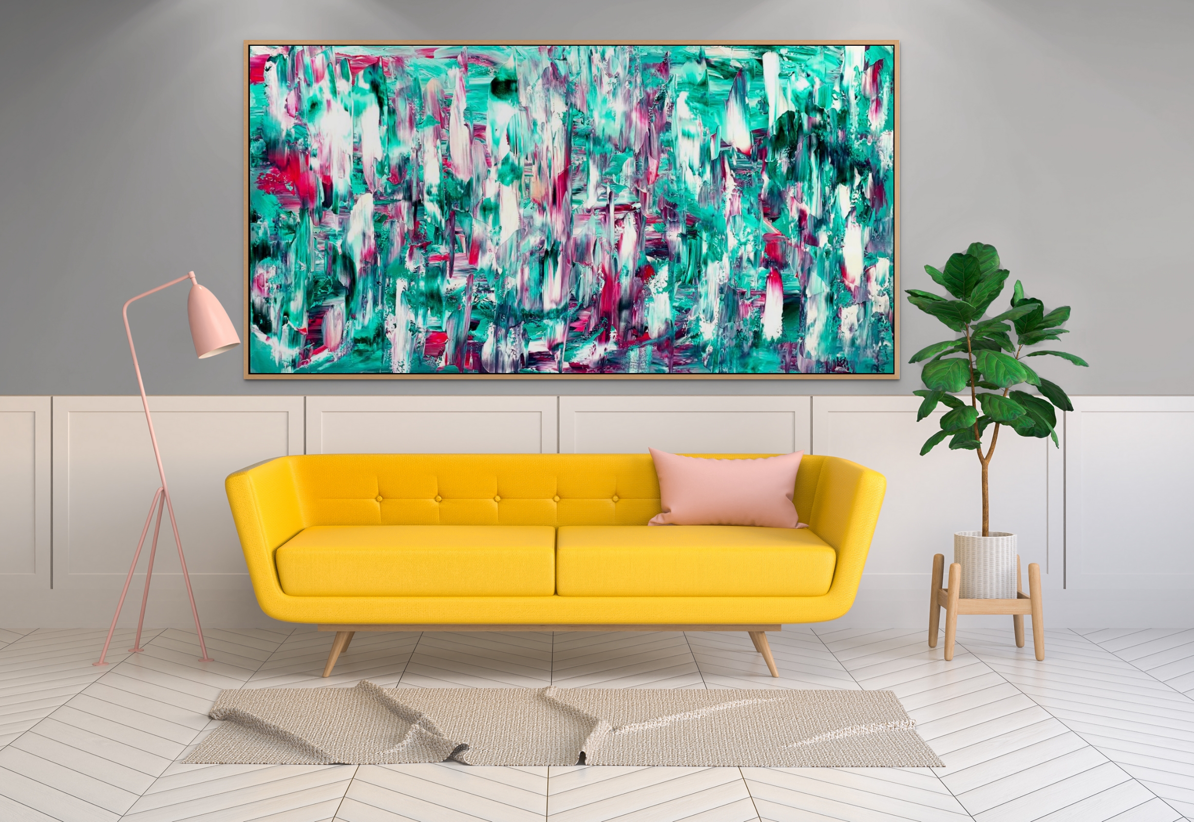 This work is painted on professional-grade Italian linen and has been sealed with varnish. The canvas has the dimensions is 213.4 cm in width by 109 cm in height. The sides are painted painted white, so there is no need for a frame.