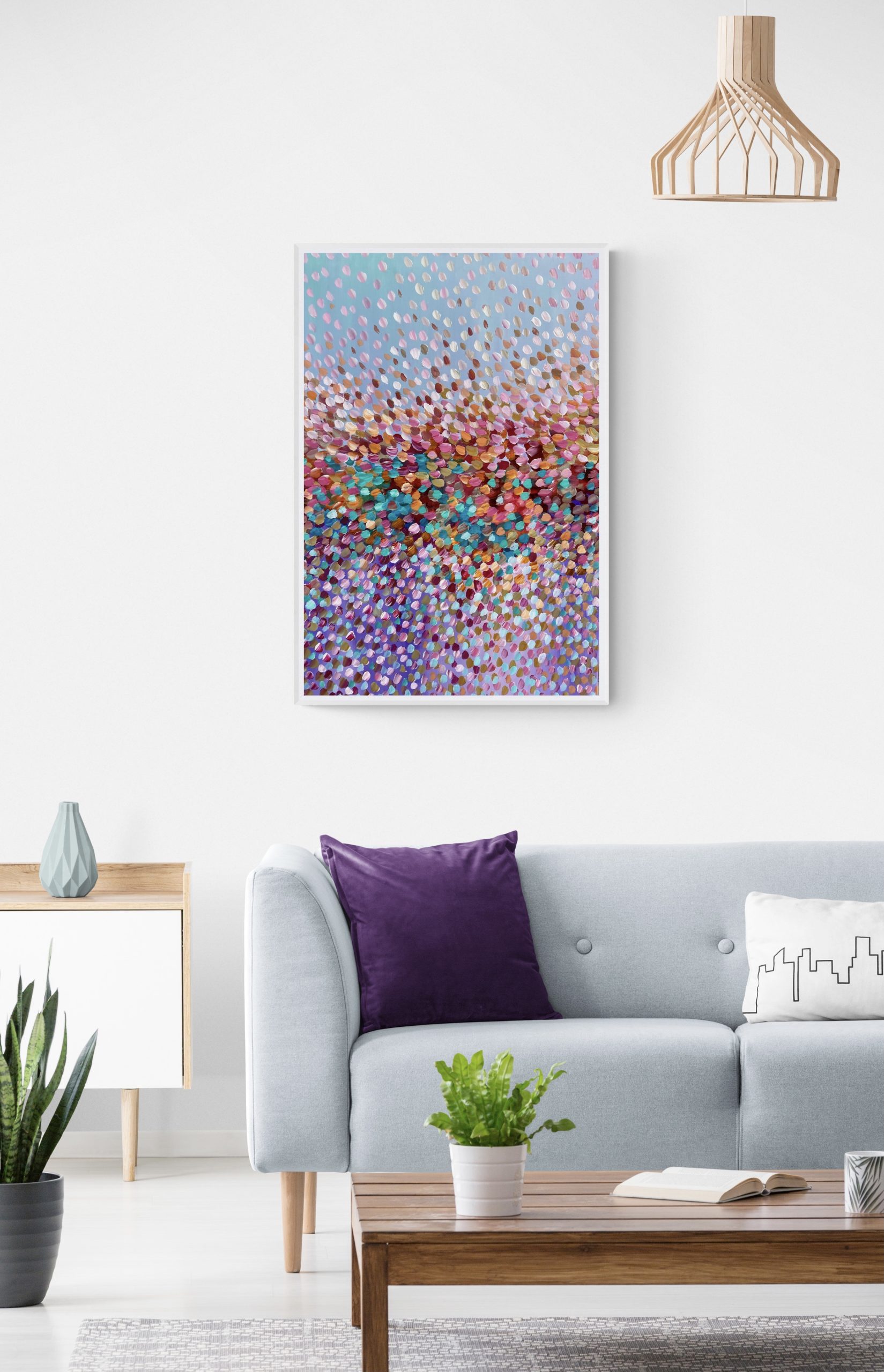 A composition of colours and rhythms of petals dancing in the sky . An explosion of petal colours in the sky swept by the winds creating fireworks in the sky. Capturing the beautiful colours of the Rainbow petals falling onto the landscape .A painting with lots of layers of paint and creating so much depth. A very peaceful and tranquil painting with so much love in the air. A beautiful bouquet in the sky. This painting is painted with Acrylic paints on linen.The painting does not come with an external frame.The painting is signed and dated 2022 at the back and comes with a certificate of Authenticity