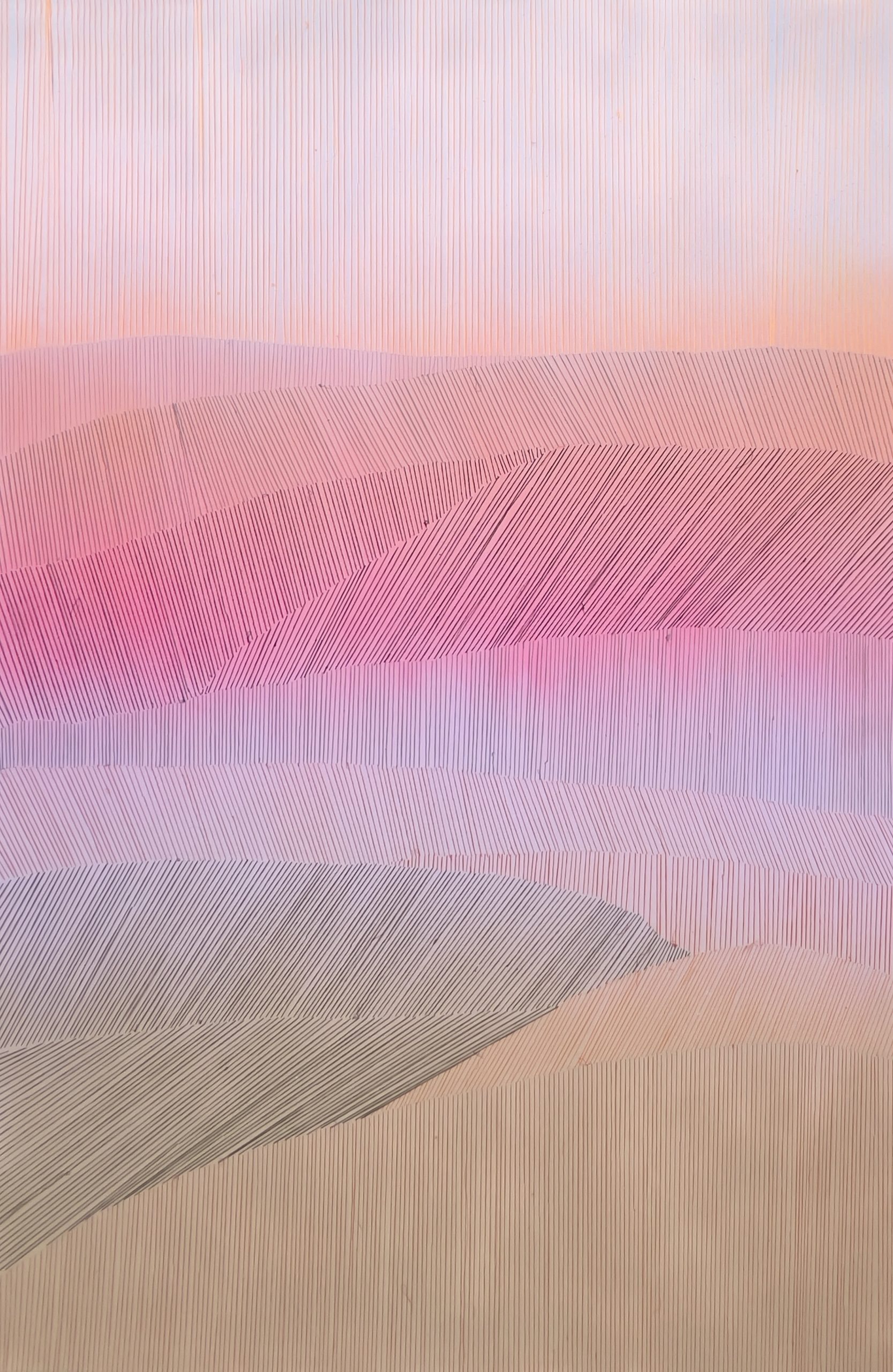 In this piece, I have captured the quiet anticipation just before sunrise at Falls Creek. A soft fluorescent glow builds across the horizon, expressed through gradients of spray-painted pinks, peaches, and violets. Hand-stitched lines trace the rolling forms of the landscape, adding texture and depth.