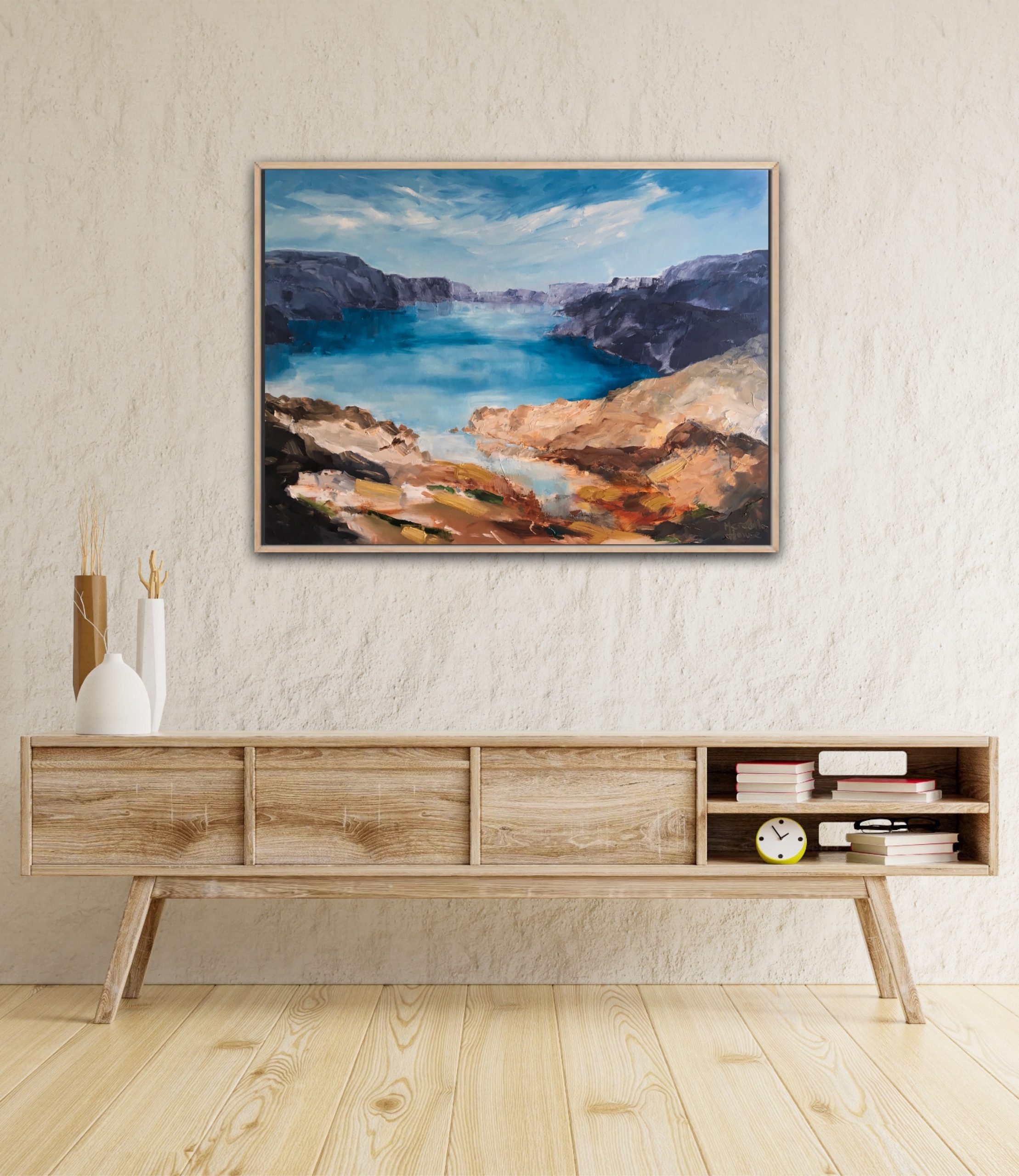 Textural oil painting with earthy colours, beautiful bright blue sky and water.