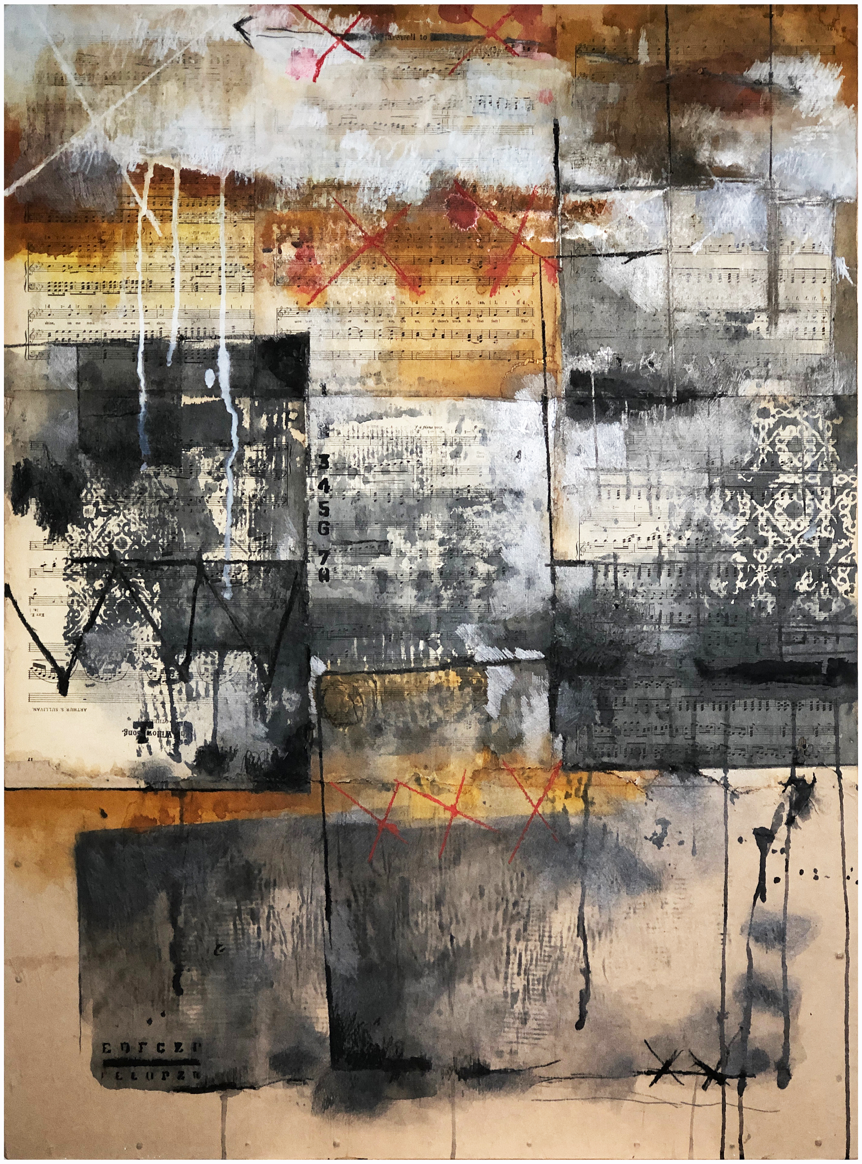 Vintage music sheets collage used as base for work, with stencil work, inks, paint and various pencils.