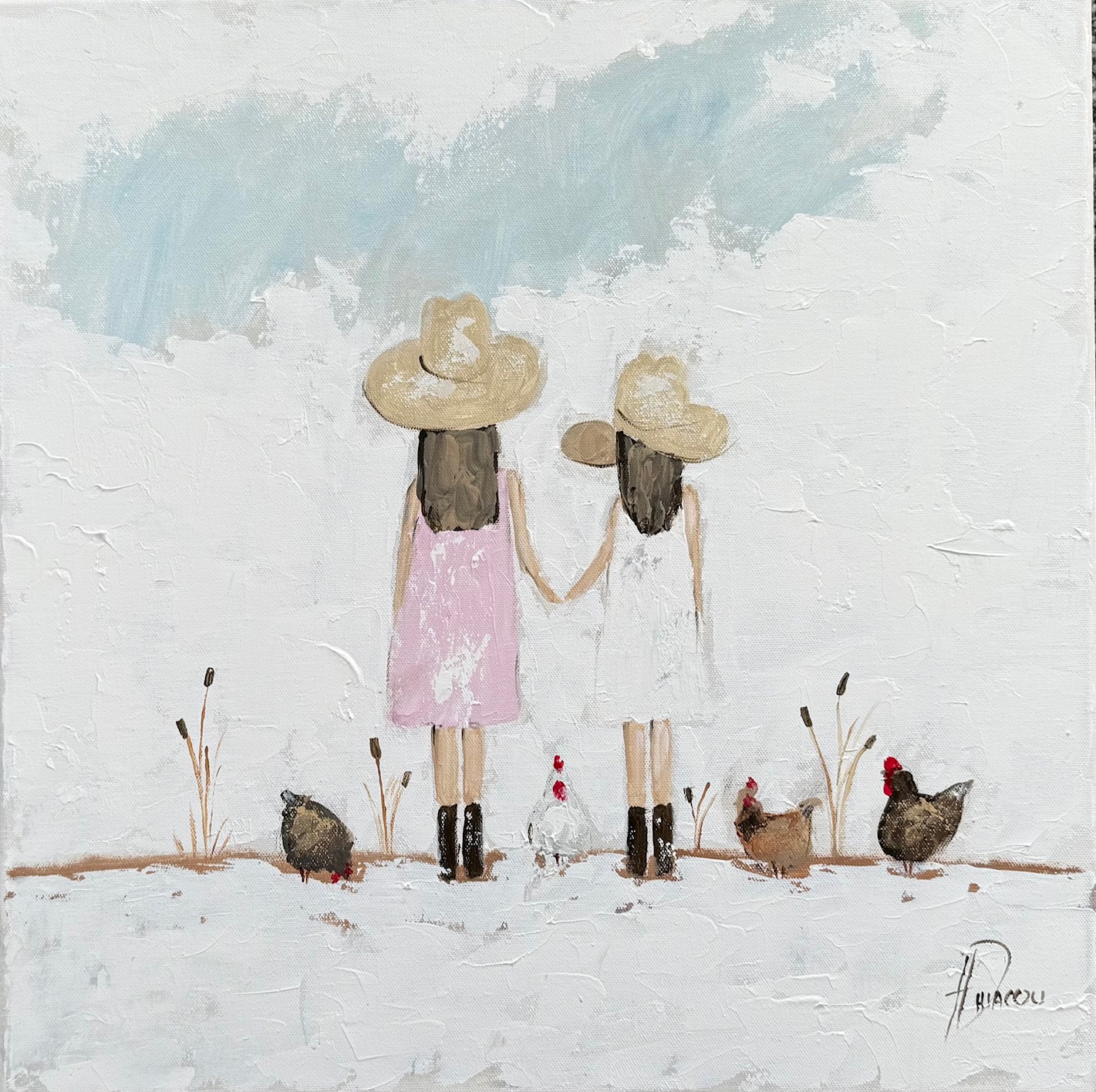 Farm Girls by Tanya Diaconu – Original Figurative painting of two cow girls in dresses doing farm chores.