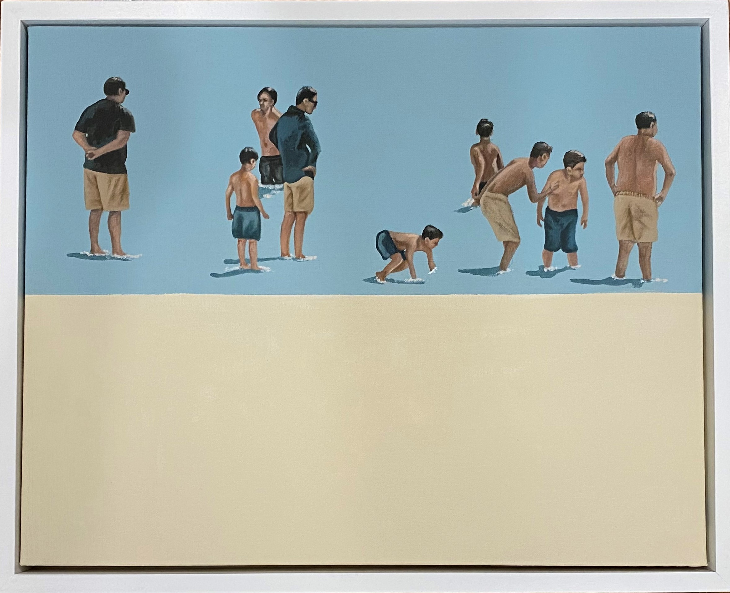 Fathers and Sons by Amanda Cameron – One of my ‘Beach Series’ of paintings and is an investigation into the interaction and connection between perspective, realism and colour. Amanda’s work is focused on the quest for finding refuge, quietness and escapism. Some [paintings] focus on the lone swimmer, the few minutes of introspection when submerged in the warm quiet of water, and others investigate the interaction of people within various aspects of the landscape. I haven’t settled on any particular style, and constantly struggle with the juxtaposition between hyper-realism and having a painterly quality to my art and this conflict in my paintings is what I am always trying to balance. This piece is painted in professional quality oil paints on a museum quality canvas, and finished with edges painted and a gloss varnish for protection. It comes with hanging wire and a certificate of authenticity.