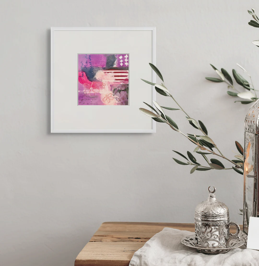 These miniature abstracts are beautifully framed in a white square shadow box frame. Total size including frame.
