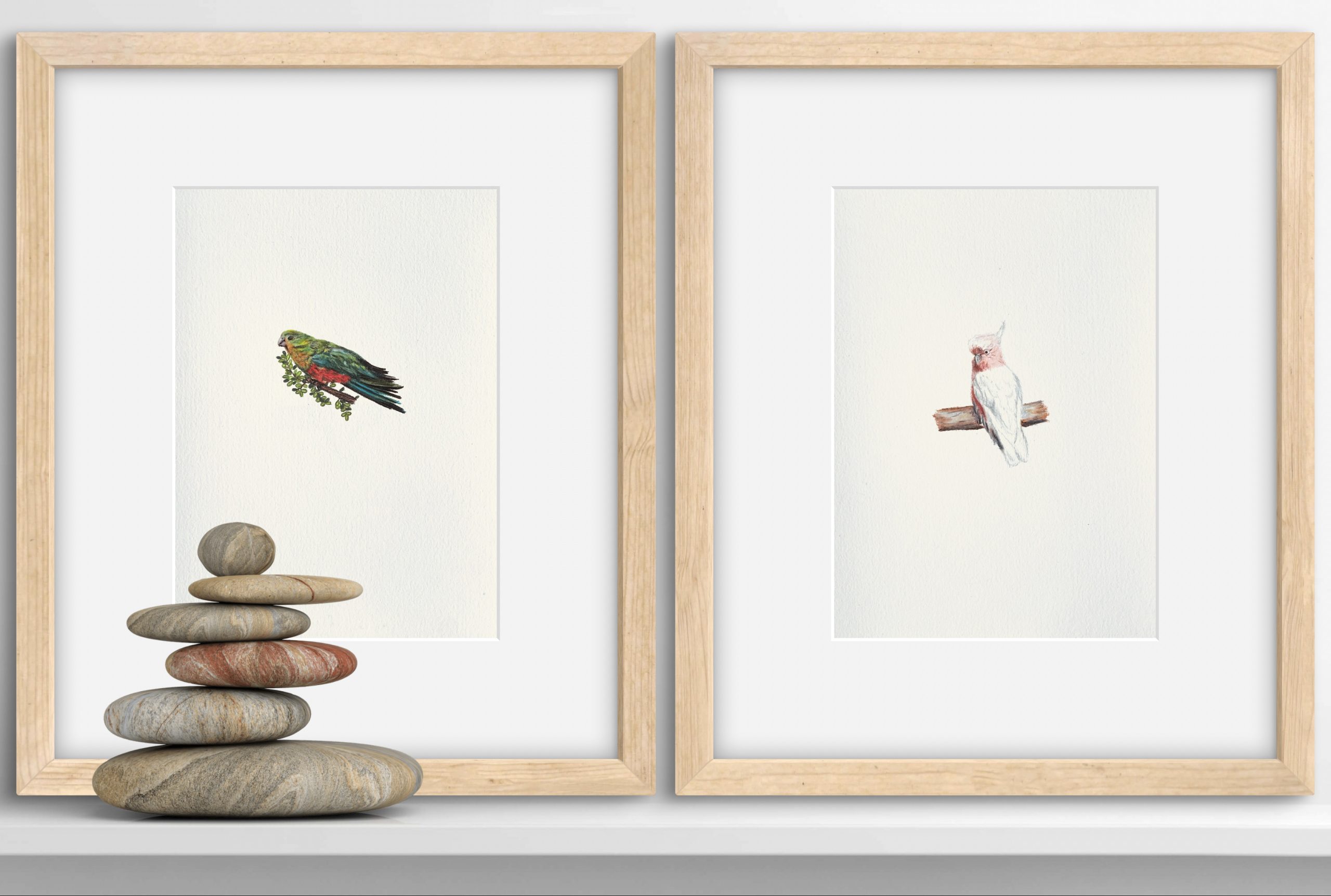 Two beautiful miniature artworks of Lady Galah and Female King Parrot done on 225gsm acid free paper with Polychromos Pencil colours.