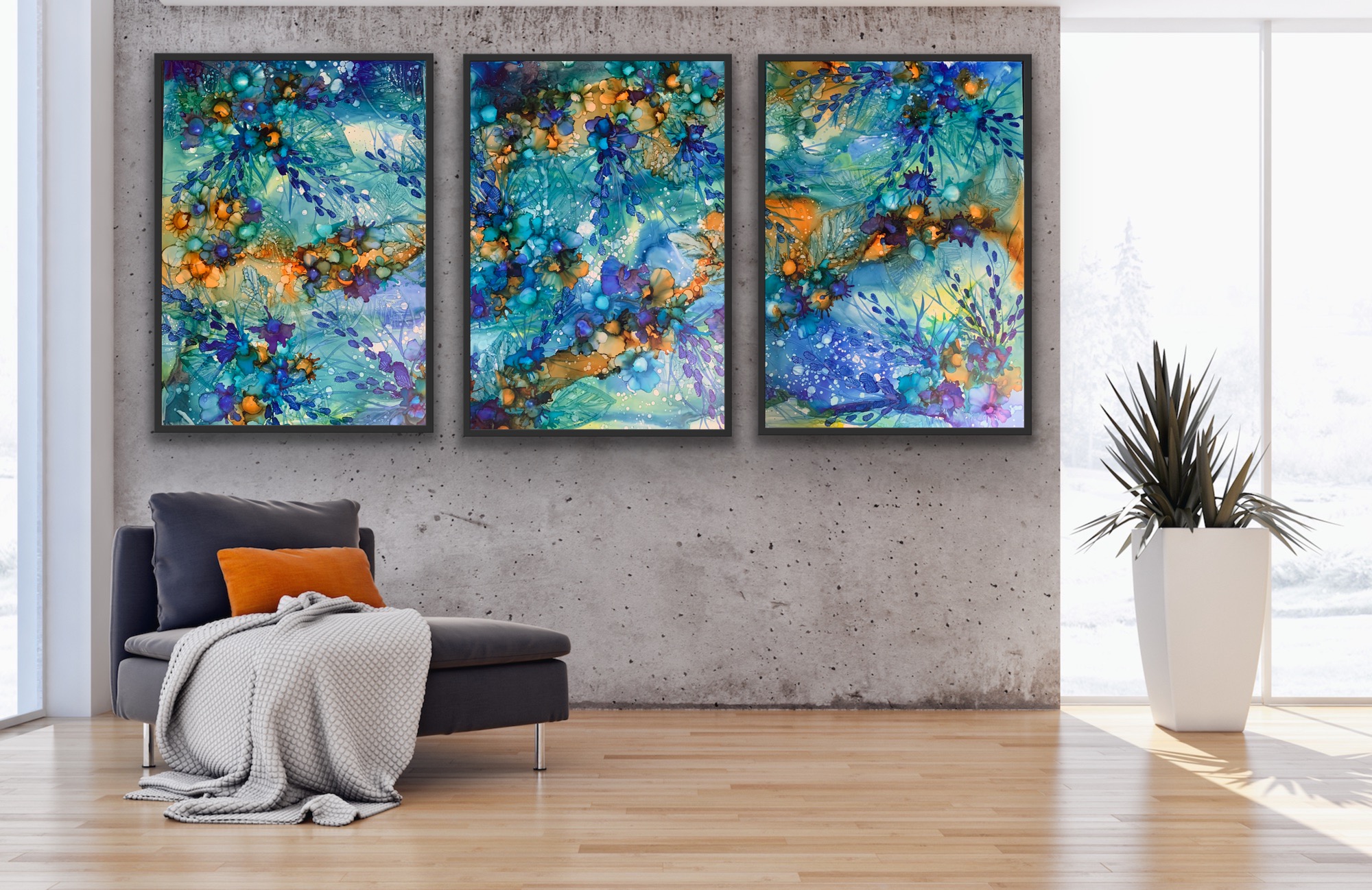 Original triptych 65 cm x 91 cm x 3 Alcohol ink on yupo paper sealed with high grade varnish and UV spray.