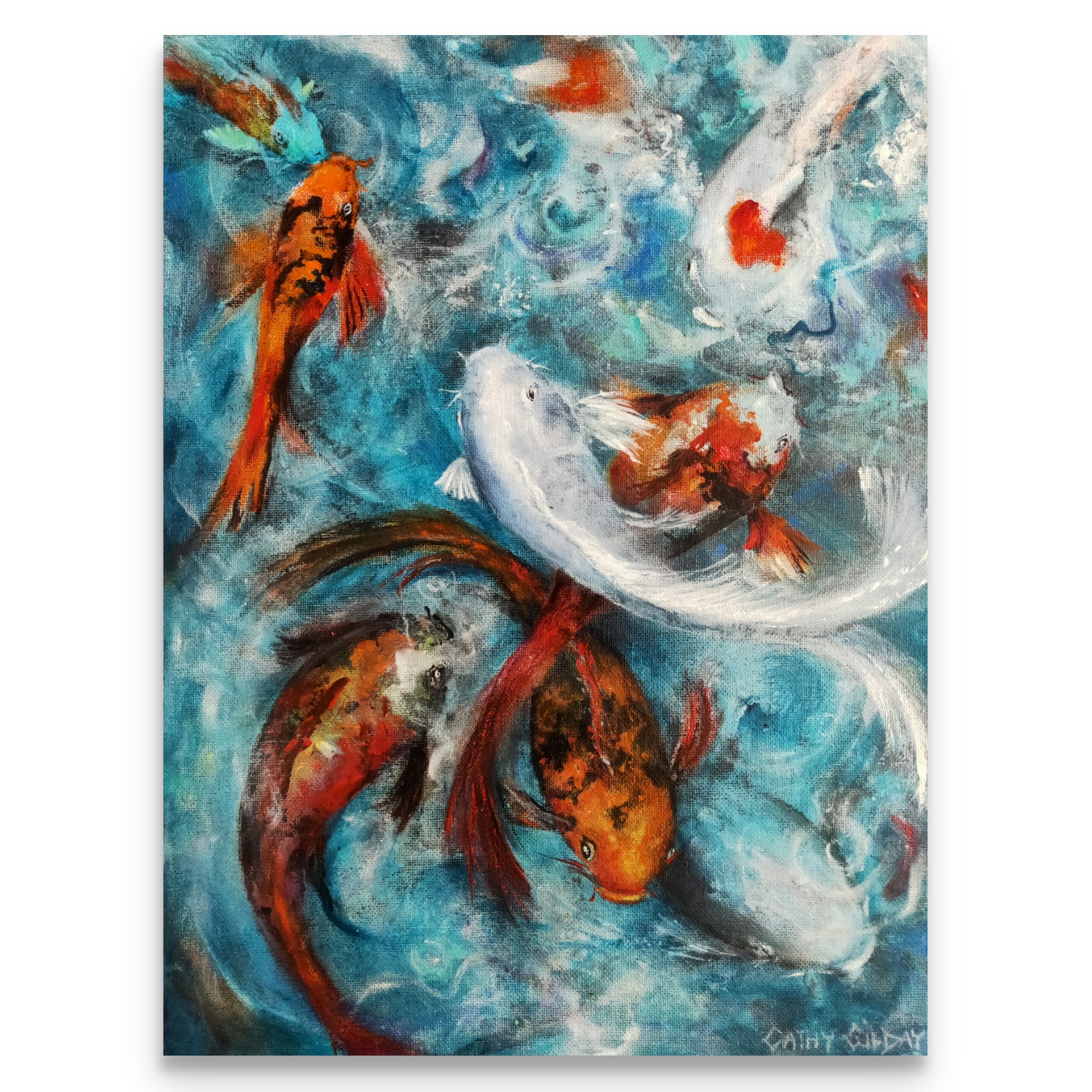 Feeding Frenzy by Cathy Gilday – Koi fish are one of my favourite refrences to paint. In this piece, I have tried to capture their frenzied movements in the water while they are feeding, by using a loose abstract background. Sides painted, sealed with two coates of satin varnish and ready to hang. Signed on front and back of canvas.