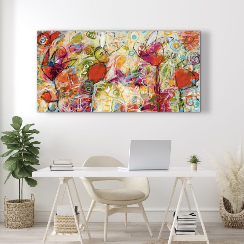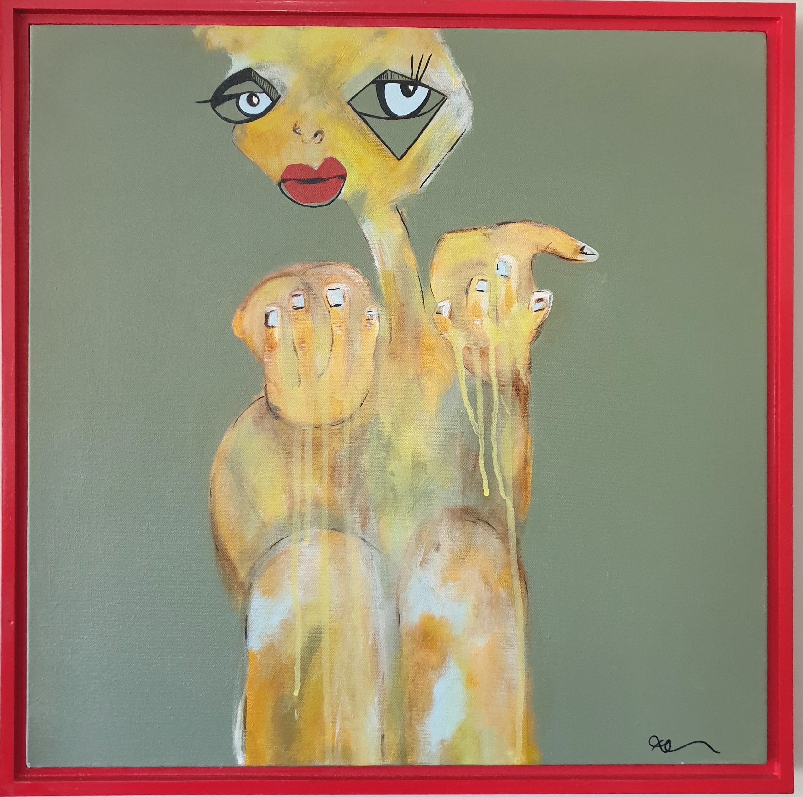 Feel Me by Karen Chappelow – Acrylic and pastel and mixed media painting on canvas, framed in wood with red gloss finish.