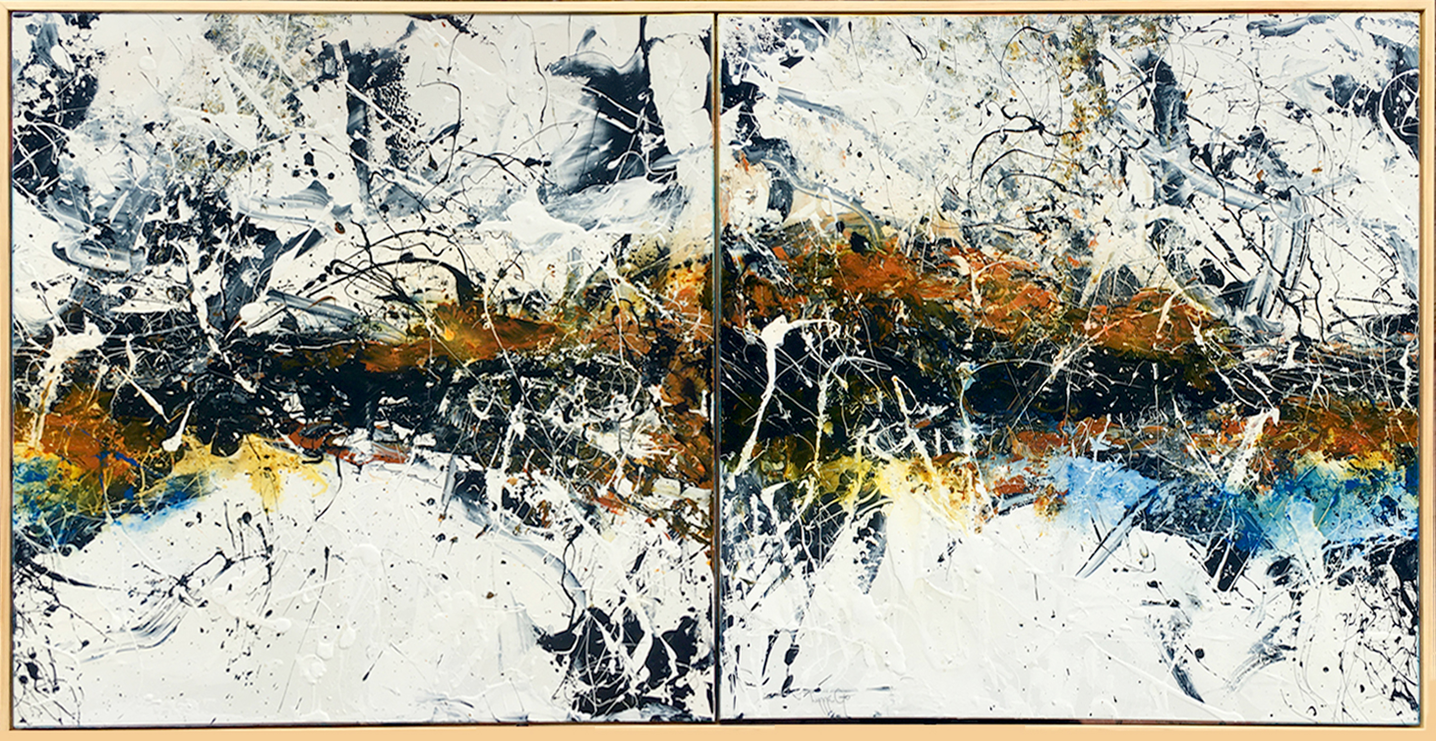 A bold, large diptych that takes on an earth vs water feel. Created with lots of texture and depth, this piece comes housed in a custom made wooden frame that makes a normally difficult installation a breeze.